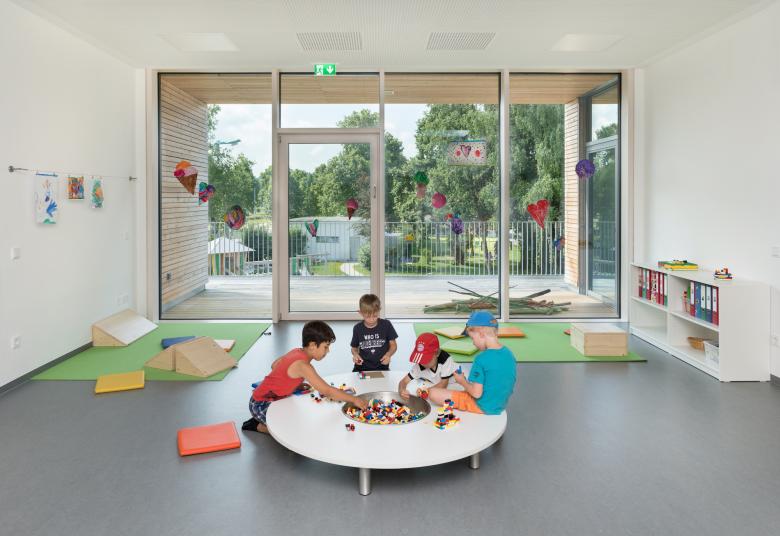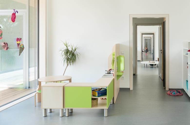 Über die Loggien und Gartentreppen kann der Garten auch direkt aus dem Obergeschoss erreicht werden. Alle Gruppen- und Aufenthaltsräume erhalten somit einen gleichwertigen Bezug zum gemeinsamen Garten. Vertikalerschließung und weitere kleinere Funktions- und Nebenräume sind in der schmaleren Raumzone straßenseitig organisiert. Die Gruppen der Kita sind entsprechend dem offenen pädagogischen Konzept als Rollenspielzimmer, Bauzimmer, Werkraum, Atelier, Lesezimmer, Forscherraum und Snozelenraum für alle Kinder vielseitig und flexibel nutzbar.