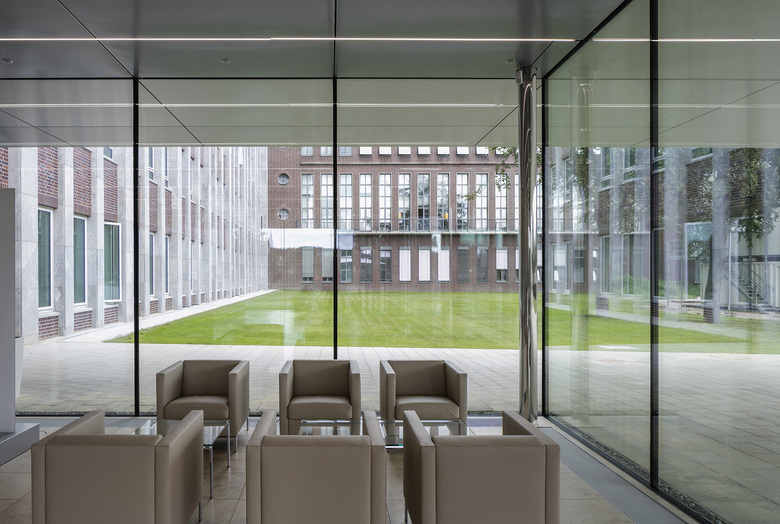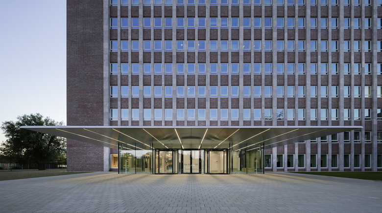 Das Gebäude erhält zwei neue Eingänge, die in ihrer eleganten und filigranen Erscheinung das Bestandsgebäude außen deutlich wahrnehmbar ergänzen. Die zeitlose Gestaltung mit Flugdächern respektiert die bisherige Formensprache des Verwaltungshochhauses und ergänzt sensibel und zurückhaltend das Gebäudeensemble.