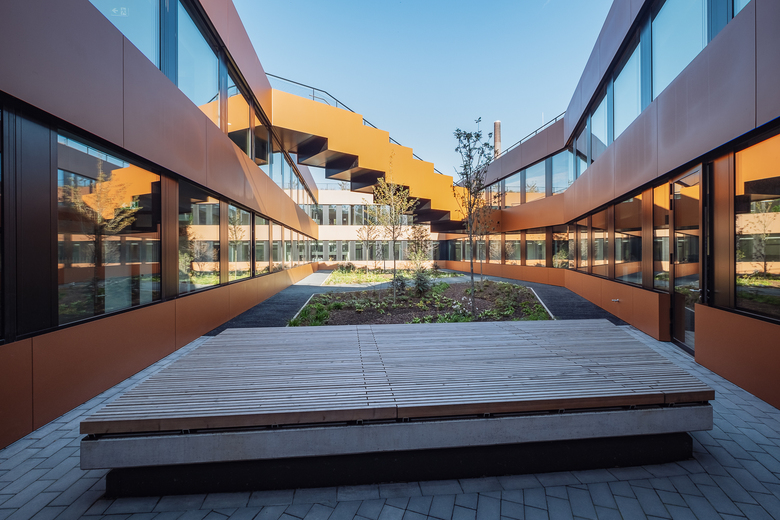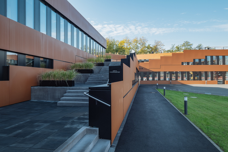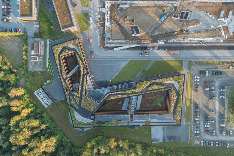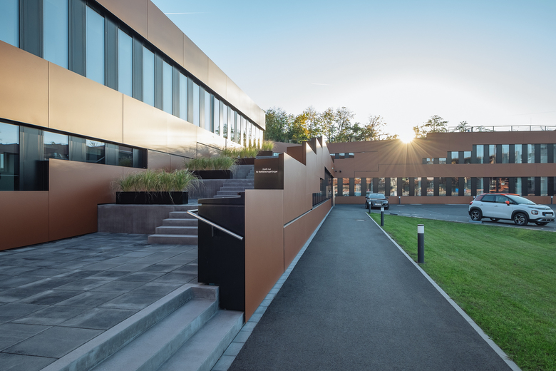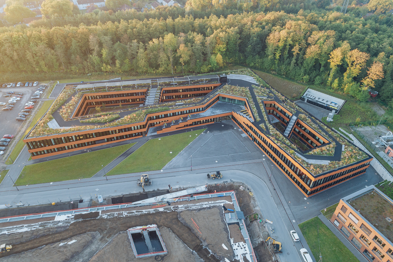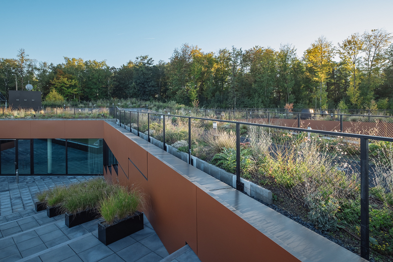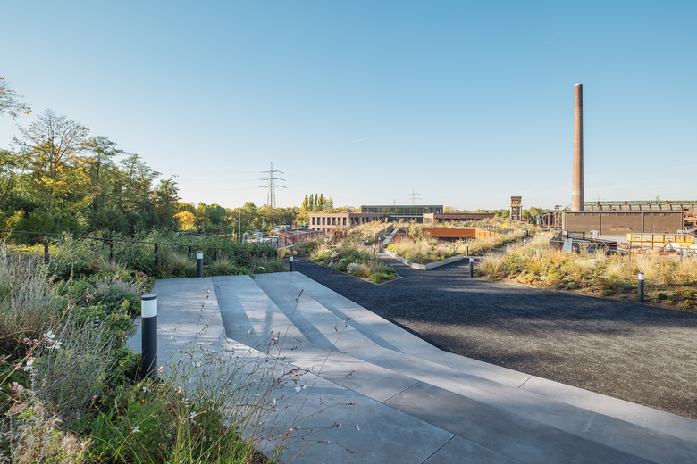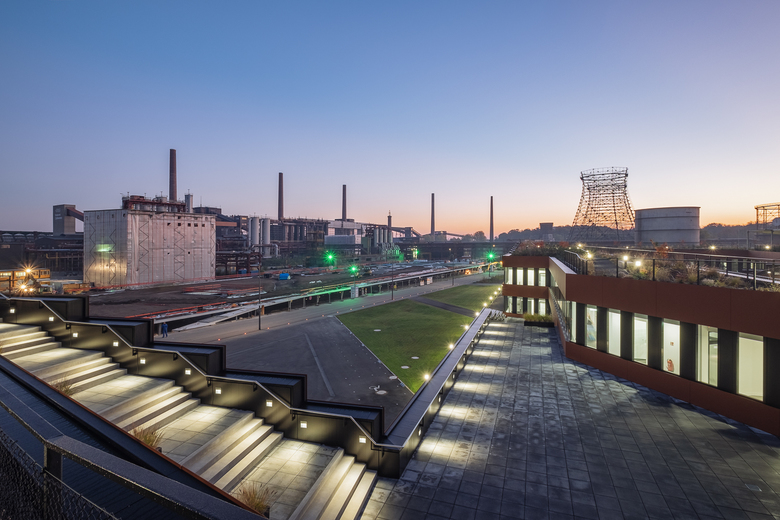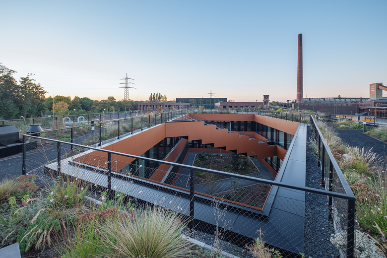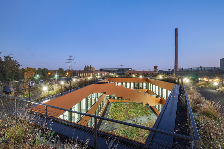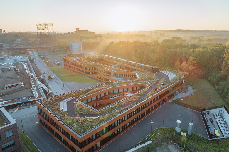 Das neue Verwaltungsgebäude von RAG-Stiftung und RAG AG liegt auf dem UNESCO-Welterbe Zollverein in Essen. Westlich des ikonischen Zechenturms und vis-a-vis der mächtigen ehemaligen Kokerei gelegen, schließt es die Ecke des Terrains am Übergang zum angrenzenden Waldstück.