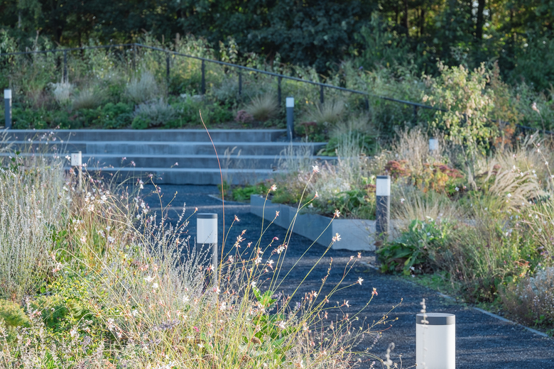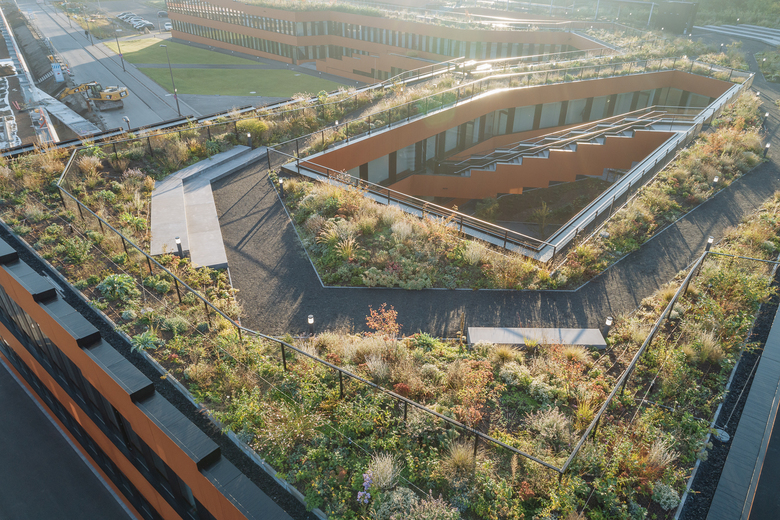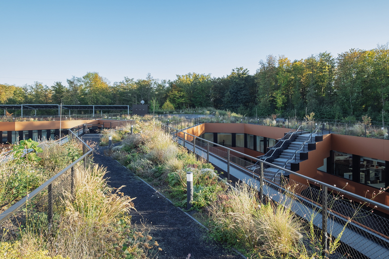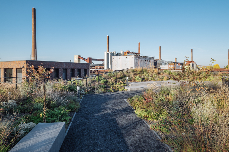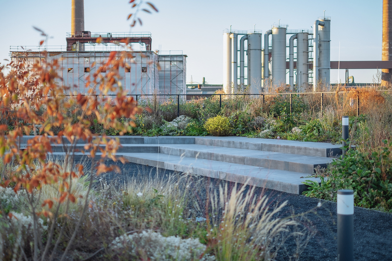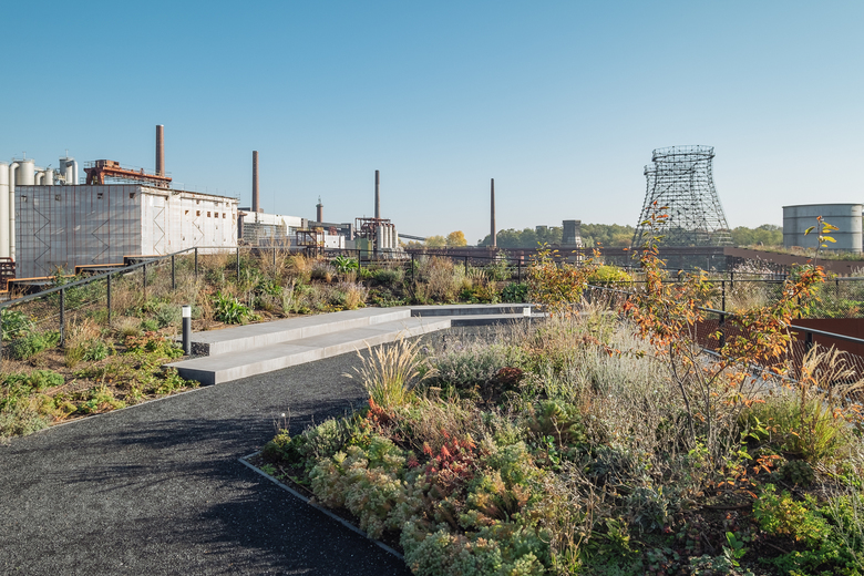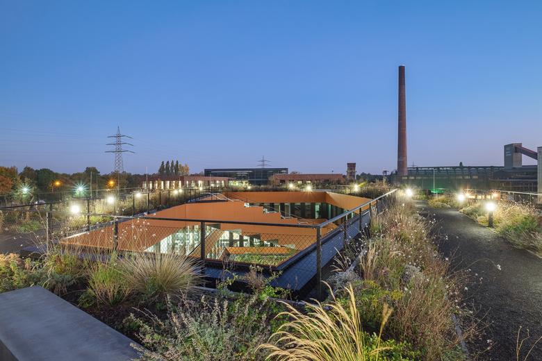 Der neue Firmen- und Stiftungssitz zeichnet sich durch besondere Gestaltung und Nachhaltigkeit aus. Das Dach ist begrünt und begehbar, mit gerade einmal zwei Stockwerken schmiegt sich das L-förmige Haus an den Rand der ehemaligen weißen Seite der Kokerei. Die Fassade folgt nicht der auf Zollverein vorherrschenden Backstein-Optik, sondern rostrote Bleche nehmen das Material und die Farbe der schlängelnden Rohrleitungen auf. Das Besondere aber sind die Baustoffe, die für die neue RAG-Zentrale verwendet wurden. „Cradle to Cradle“, übersetzt „Wiege zu Wiege“ heißt das Nachhaltigkeits-Prinzip, das sinnbildlich zum