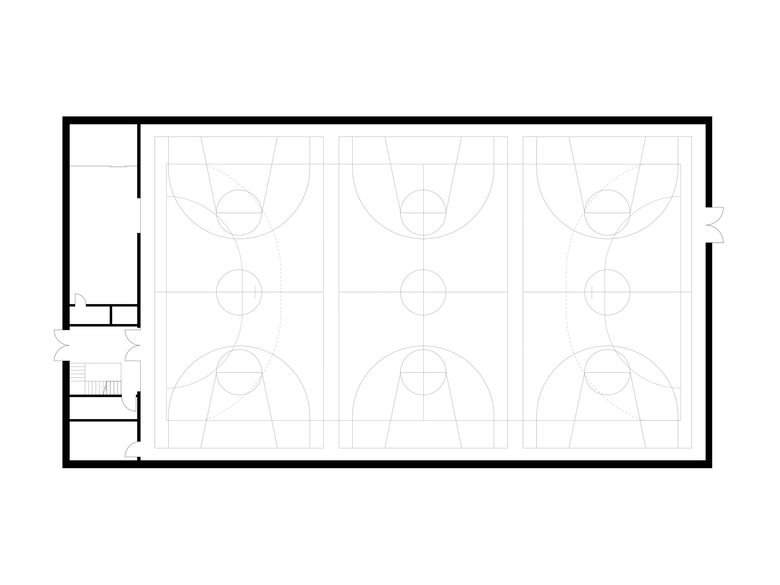 Gedacht als eine dünne papierartige Haut, wurde die Fassade vor Ort vom Spengler von Hand aus Titanzinkblech erstellt. Präzis gefügt und detailliert gestaltet umspannt die neue Stehfalzfassade die bestehende, nach aussen geneigte Stahlkonstruktion. Die Fichten-Dreischichtplatten und der lackierte Stahl kombiniert mit dem dunkelgrauen Sportboden prägen als einfache, robuste und haptische Materialien die Atmosphäre der Halle. Über die vergrösserten längsseitigen Fensterbänder fällt viel Tageslicht in den Raum. Sämtliche Installationen sind in weisser Farbe ausgeführt, präzis gesetzt und sind, wo nötig, neu entwickelt.