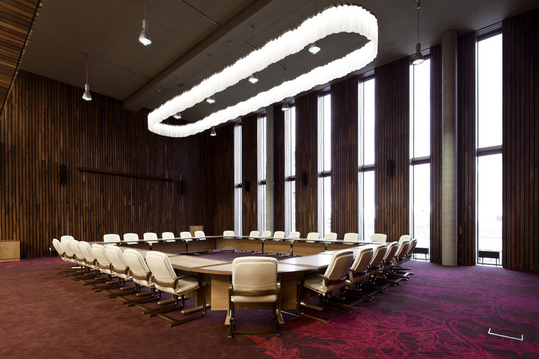 The Council Chamber and council offices located on level 2 are distinguished from the lower levels by a change in materiality from exposed concrete walls to walnut cladding. The Council Chamber is characterised by a contemporary chandelier and bespoke carpet with thistle motif designed by Timorous Beasties - a reference to Corby’s Scottish heritage.