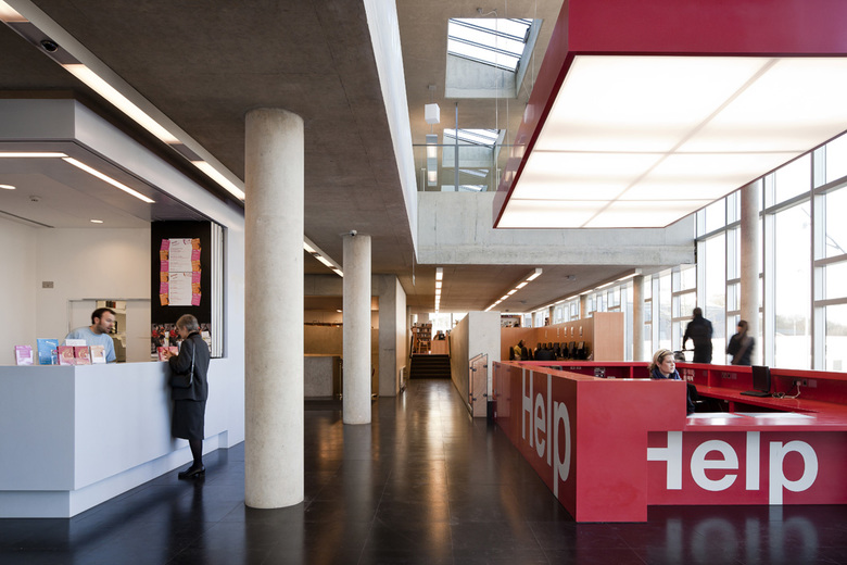 Care has been taken to integrate details such as the bespoke joinery and seating within the language of the building as a whole. Signage and graphics produced in collaboration with graphic design studio SEA enrich the interior and enhance the library's own identity within the building.