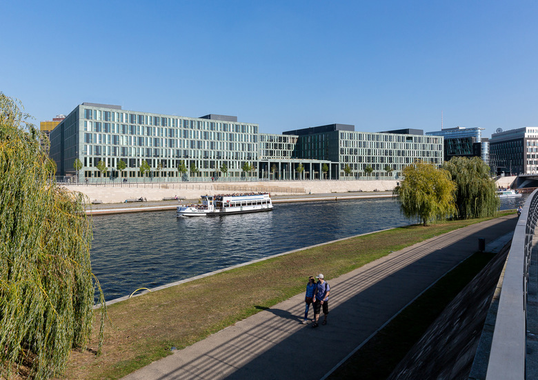 Ein nachhaltiger Stadtbaustein – Die prägnante architektonische Gestaltung des Neubaus orientiert sich am Leitbild der Spreebogenbebauung. Der Solitär beruhigt als Bindeglied der Uferbebauung das heterogene städtische Umfeld mit seiner durchgehenden Trauflinie und der klaren Fassadenstruktur. Der Eingangsbereich wird durch eine Staffelung von öffentlichem, halböffentlichem und privatem Raum definiert. Im Inneren steht die Aufenthaltsqualität der Büros im Vordergrund. Die brüstungsfreie Fassade ermöglicht einen freien Blick vom Schreibtisch aus in den Stadtraum.