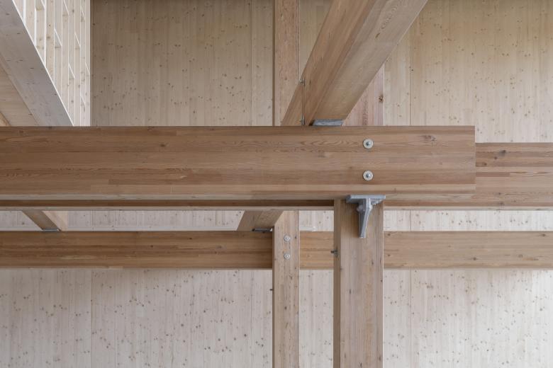 Die Konstruktion orientiert sich an der ortstypischen Pfahlbauweise und interpretiert diese neu. Sie besteht aus einer frei bewitterten Stützen- und Trägermatrix aus Brettschichtholz, in der fünf überdimensionale Massivholzkuben in verschiedenen Höhen und Positionen eingeschoben sind. Die Aufgabe des Projekts bestand darin, eine nachhaltige, ökologische und touristisch wie gesellschaftlich innovative Lösung zu finden, die zur Attraktivität des Orts beiträgt.