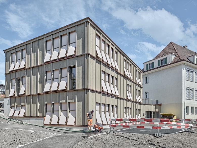 Das Gebäude wurde als Beton-Holz-Hybridbau ausgeführt: die erdberührten Wände und der zentrale Kern in Stahlbetonbauweise gewährleisten Erdbebensicherheit, Schallschutz und thermische Speichermasse. Die Gebäudehülle wird im Sinne der Nachhaltigkeit in Holzbauweise materialisiert. Vertikale Lisenen strukturieren die Fassade und zitieren das Fachwerk des abgebrochenen Bestandsgebäudes auf eine zeitgenössische Art und Weise. Der strenge Rhythmus wird durch kupferverblechte Gesimse durchbrochen, die die silbergrau vorpatinierten Holzoberflächen fein durchziehen. Hellrosa Stoffmarkisen setzen farbige Akzente und geben dem Gebäude ein wandelndes und spielerisches Erscheinungsbild.
