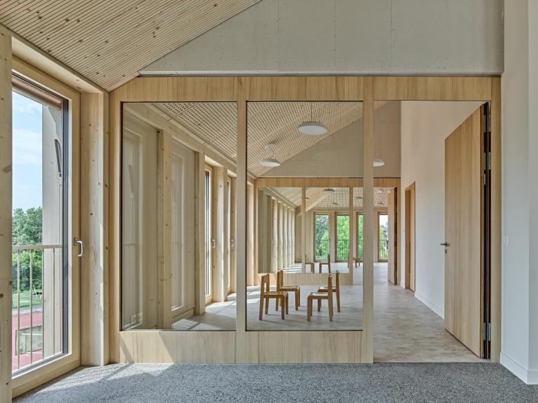 Der eingestellte Kern mit Nebenräumen zoniert den Grundriss in Kindergartenklasse, Gruppenraum und Garderobe. Es entsteht ein fließender und stützenfreier Raum, der durch große Innenverglasungen zusammenhängend erfahrbar bleibt. Durch die sichtbar belassene Holz-Tragstruktur wird die Gliederung in der Fassade auch im Inneren erfahrbar und umrahmt den offenen Grundriss mit einem gleichmäßigen Stakkato aus offenen und geschlossenen Feldern.