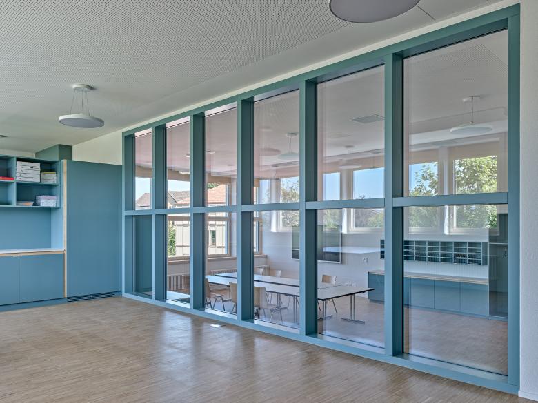 Der Fußboden aus Weißtanne-Hirnholzparkett wird nur im Erschließungsbereich durch einen robusten, geschliffenen Hartbeton ersetzt. Die inneren Ausfachungen der Außenwände sind mit akustisch wirksamen Pinnwand-Elementen belegt, welche die vielfältigen Ausblicke in die Umgebung einrahmen.