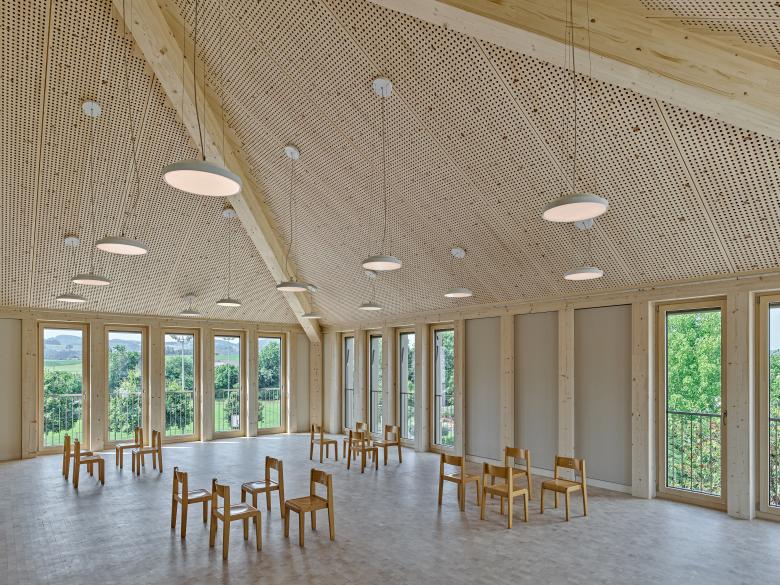 Im Innenraum dominieren helle Nadelhölzer wie Fichte und Tanne. Den wesentlichen atmosphärischen Beitrag schafft hierbei das sichtbar belassene Tragwerk aus Holzstützen und -trägern sowie die für eine bessere Raumakustik unterseitig perforierten Hohlkastendecken.