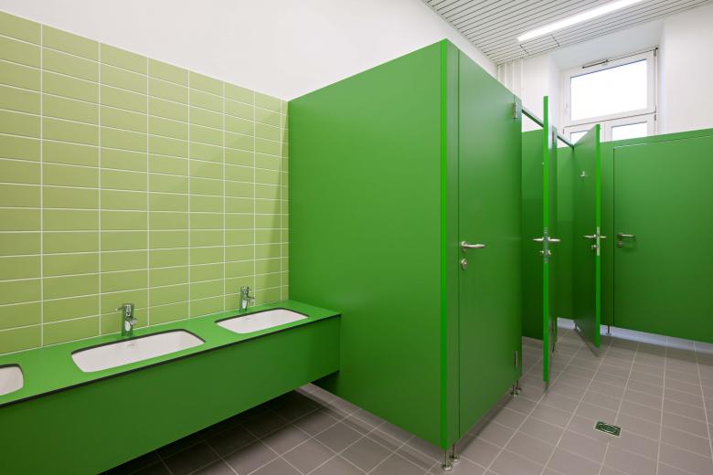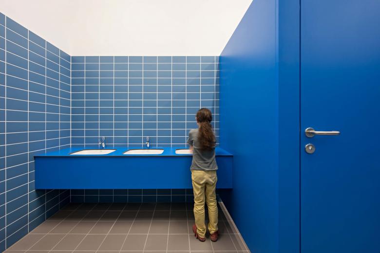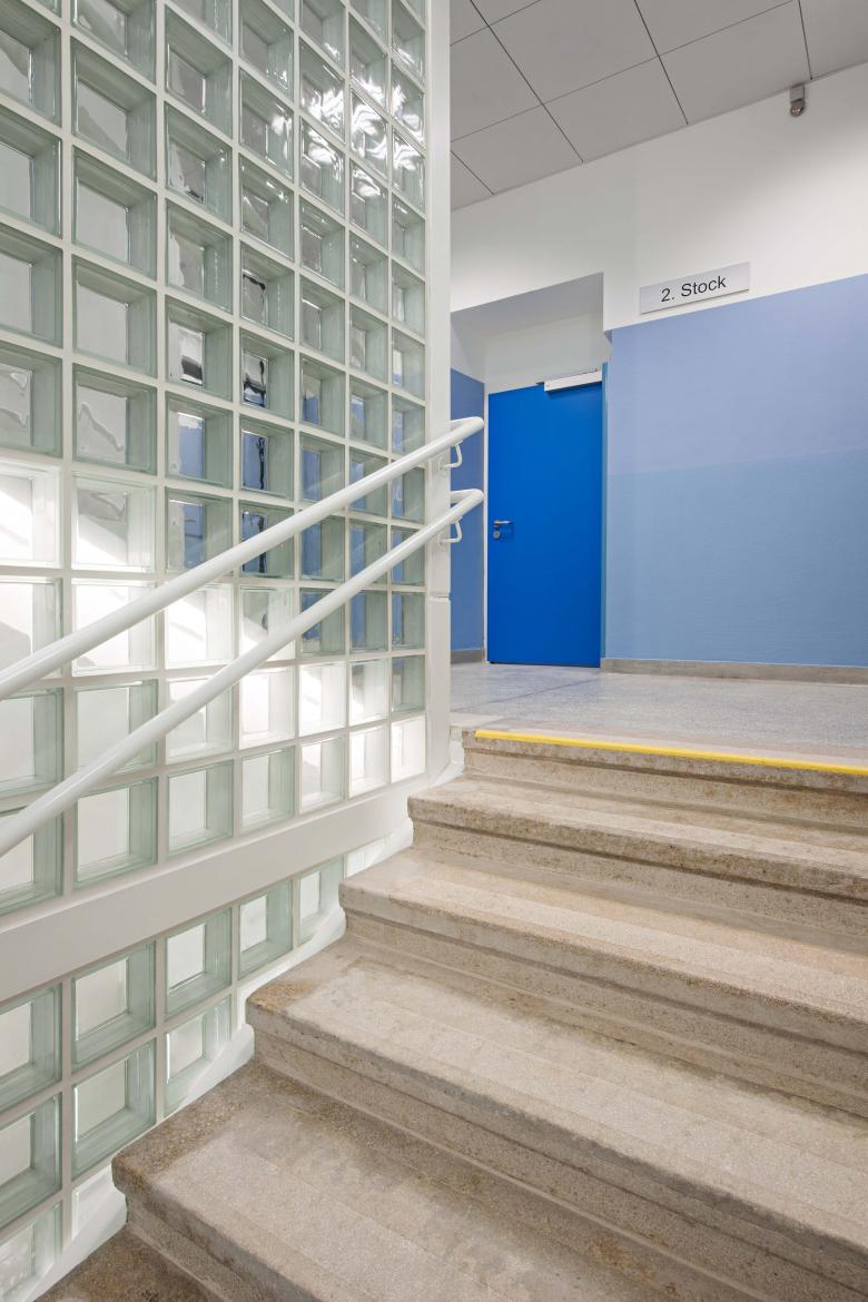 Die Farbnuancen des bestehenden Terrazzobelages werden als Grundfarbton für die Material- und Oberflächengestaltung eingesetzt, wodurch eine zurückhaltende Ton-in-Ton Gestaltung entsteht, welche das Grundgerüst für farbige Akzente mit Grün- und Blautönen bildet. Als „Hingucker“ wird das Thema „Regenbogenschule“ aufgenommen und mit vier variierenden farbigen Streifen über Hort- und Schulgeschosse aufgespannt.
