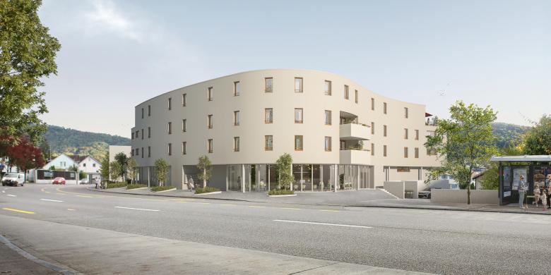 Volumetrisch an die südöstlich an der Landstrasse gelegenen Bestandesbauten anschliessend und den leichten Drall der vielbefahrenen Verkehrsader strassenseitig aufnehmend, biegt sich das elegante Gebäude an der Kreuzung der Breitestrasse zur charakteristisch asymmetrischen Bogenform und führt den Strassenverlauf so auf selbstverständliche Weise zur eigenen Zufahrt und ins anliegende Quartier fort.