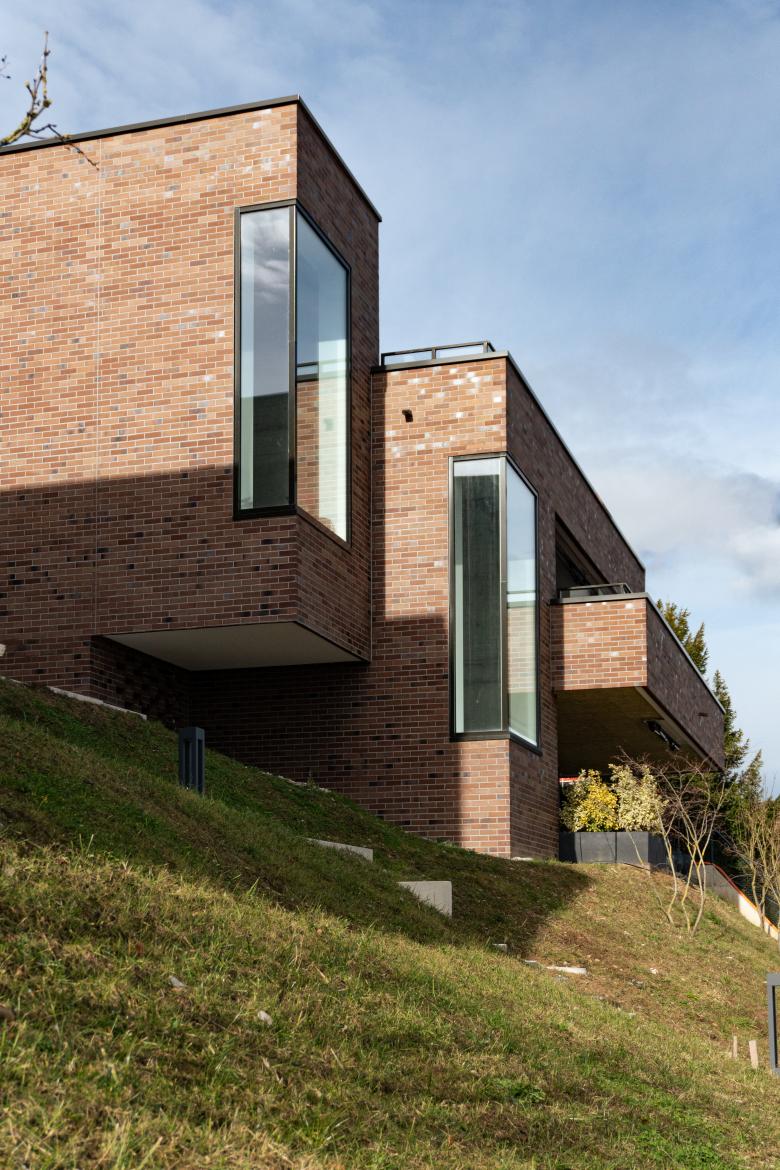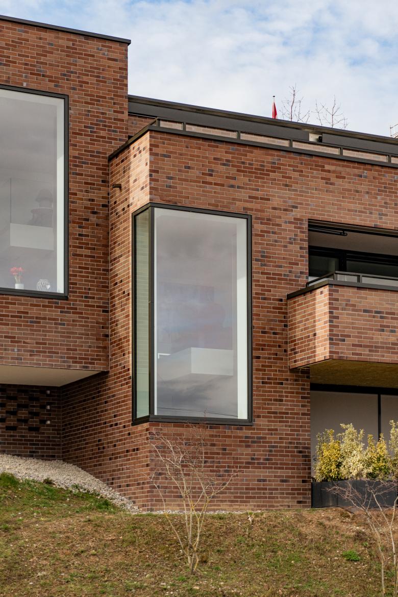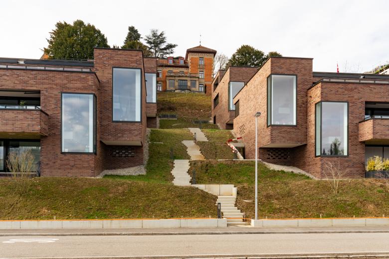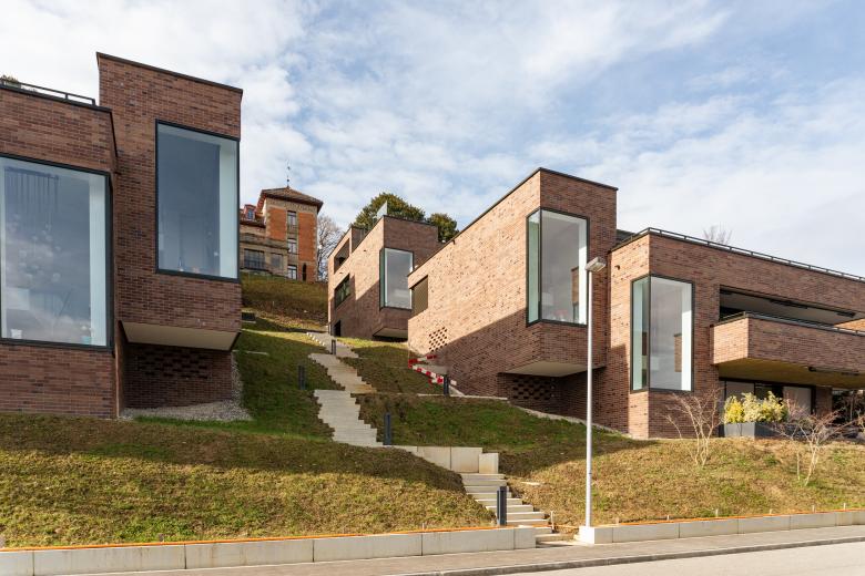 Die vier Bauten gliedern sich in ihrer Volumetrie und Massstäblichkeit harmonisch ins Bebauungsmuster der Umgebung ein. Durch die klare, zeitgemässe Architektursprache und die einheitliche Materialisierung in Klinkerriemchen entsteht ein zusammenhängendes Erscheinungsbild, das zusammen mit der bestehenden Villa Schönfels ein eindrucksvolles Ensemble bildet.