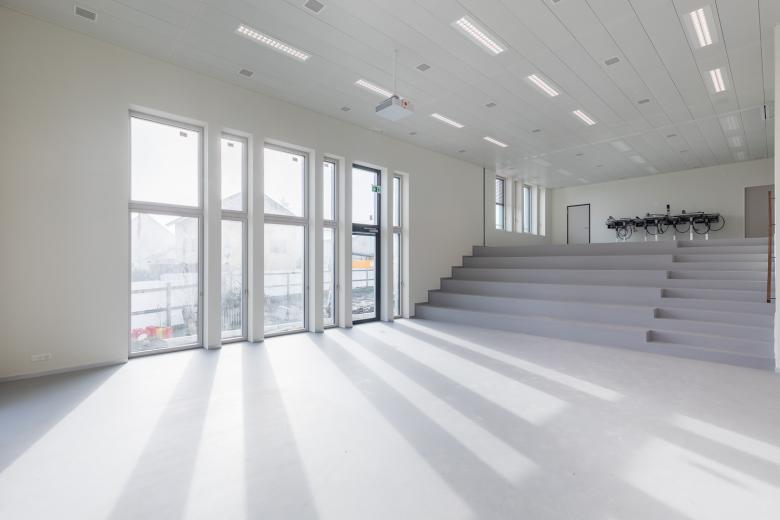 Ein einfaches Grundrisssystem mit einer einhüftigen Erschliessungszone prägt den neuen Baukörper und kann so die geforderten Nutzungen auf kompaktem Raum in sich vereinen. Im „Kopf“ des Gebäudes sitzt ein Mehrzwecksaal, der auch von externen Nutzern bespielt werden kann. Den Bezügen zwischen Innen und Aussen wird besonders grosse Aufmerksamkeit geschenkt.