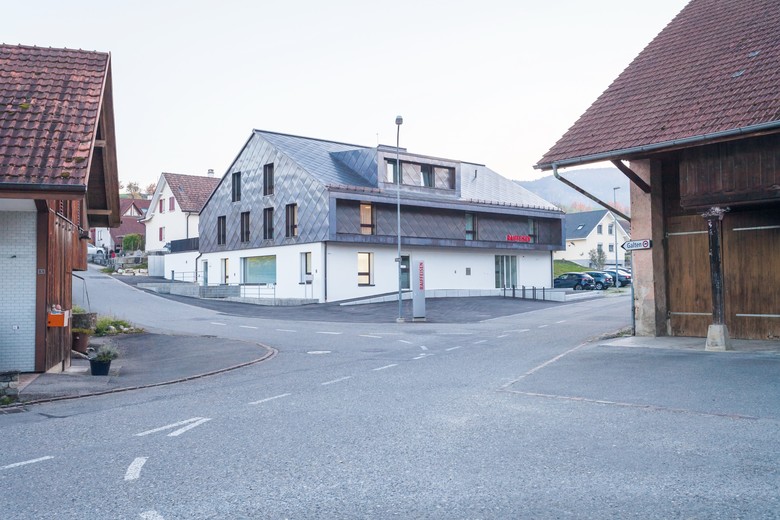 Die Filiale der Raiffeisenbank Mettauertal war in die Jahre gekommen, hinsichtlich baulicher Substanz und betrieblicher Abläufe bestand Handlungs- bedarf. Durch gezielte architektonische Eingriffe wird unter Beibehaltung der Gebäude-Grundstruktur mit einfachen und klaren Layouts eine zeit- gemässe Bank liale geschaffen. Der Bankzugang wird versetzt, die Zugangs- und Parkierungssituation im Vorbereich des Grundstücks geklärt. Die Kundenhalle mit ihrer räumlichen Höhenstaffelung wird zu einem besonders attraktiven Raumerlebnis. Ein mehrgeschossiger Lichtraum in der Mitte der Halle setzt im Herzstück der Bank einen entsprechenden Akzent und versorgt den Empfangsbereich mit zenitalem Tageslicht .