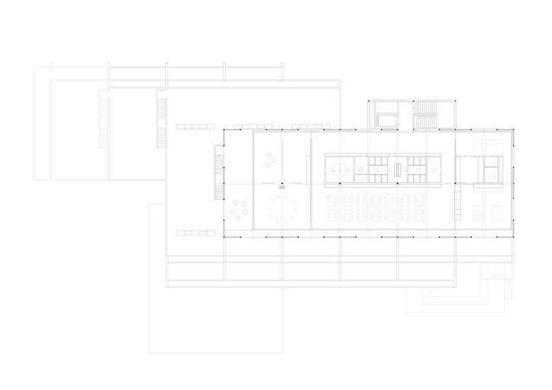 Si compone di un’intelaiatura strutturale che ne definisce l’aspetto formale – e di fatto la facciata – e di uno spazio riscaldato arretrato rispetto al perimetro che determina due zone che riprendono il ritmo e la disposizione planimetrica dei piani sottostanti: un’area a Sud adibita ad orto o terrazza verde e uno spazio coperto verso Ovest in relazione con la sala modulabile del doposcuola.
