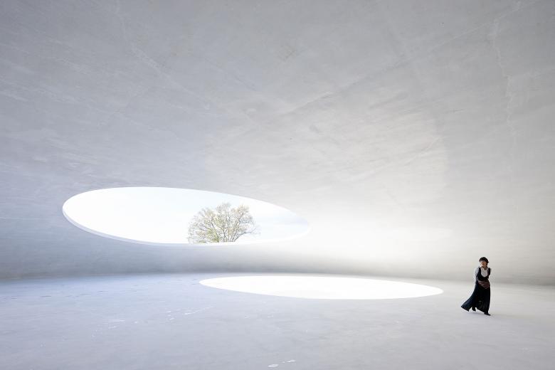 Uniting the creative visions of artist Rei Naito and architect Ryue Nishizawa, Teshima Art Museum stands on a hill on the island of Teshima overlooking the Seto Inland Sea. The museum, which resembles a water droplet at the moment of landing, is located in the corner of a rice terrace that was restored in collaboration with local residents.
