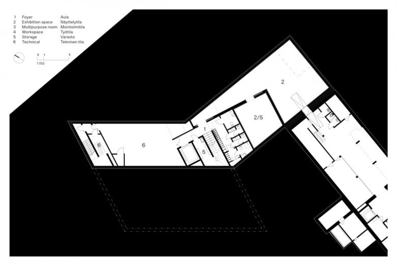 JKMM have expressed the timber structure of the building on its upper levels as a way of introducing tactility and warmth into the galleries. The main exhibition galleries are located on the top of the building on level two. On level one – in Finland, the ground floor – the key spaces are the main entrance and a generous multi-purpose foyer connected to a picturesque museum garden shared with its neighbouring institutions.
