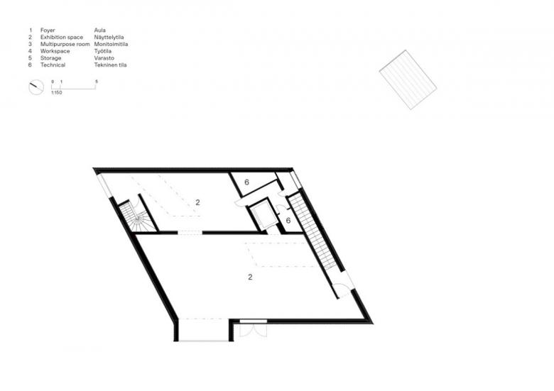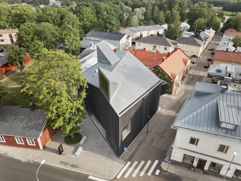 Located in the museum quarter in the heart of Tammisaari’s old town, Chappe is a 1,210 sqm addition to this mix of cultural attractions. In fact, an essential element of JKMM’s brief in designing the art house was to connect it to the existing art complex set in and around the regional Raseborg Museum. Physically, this is achieved through an underground link from the basement level of Chappe and through a shared museum garden.