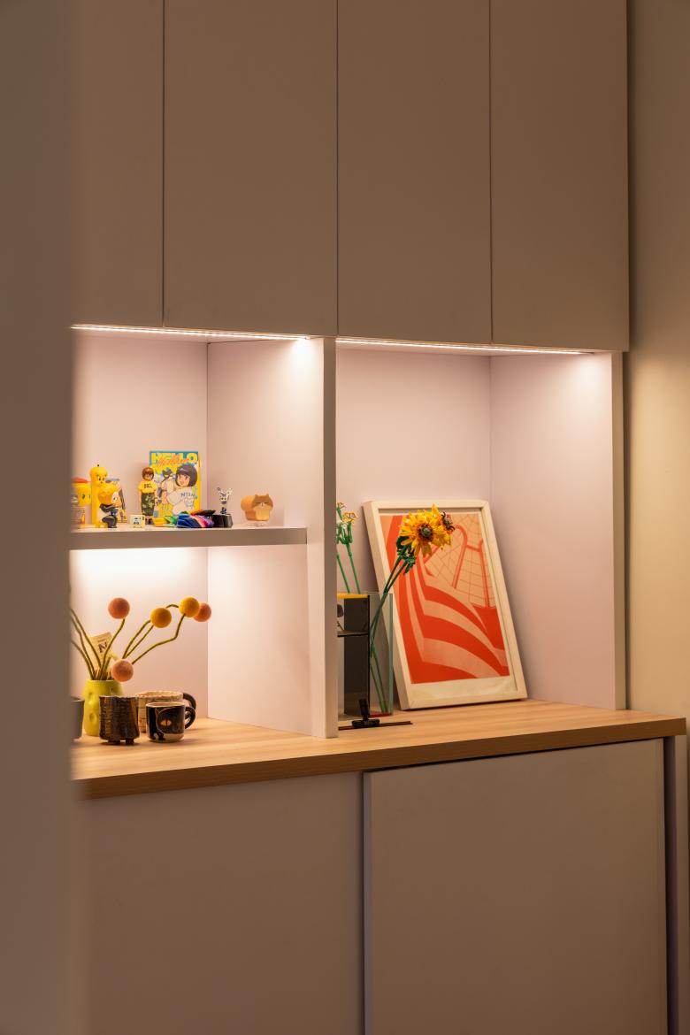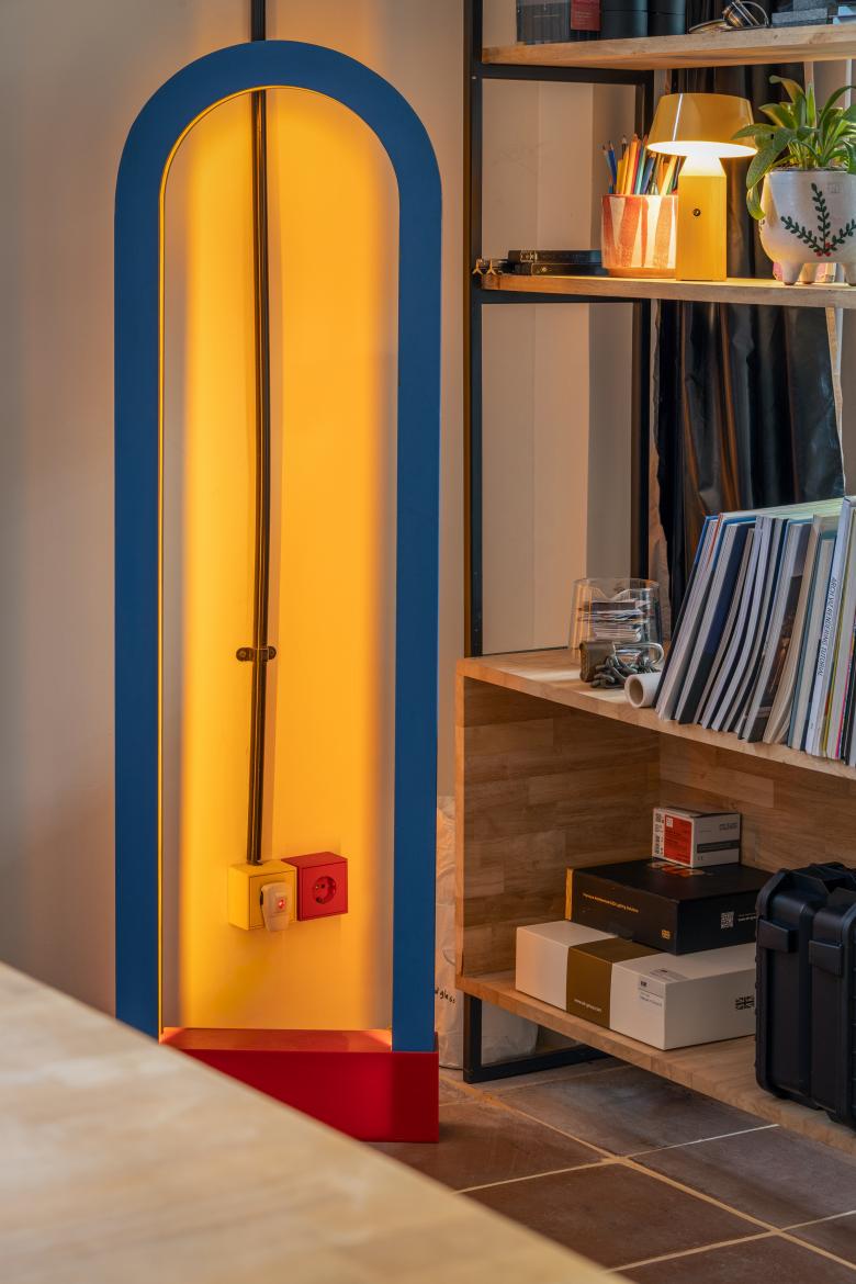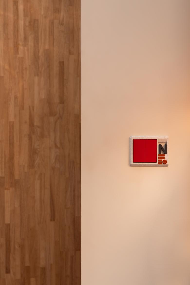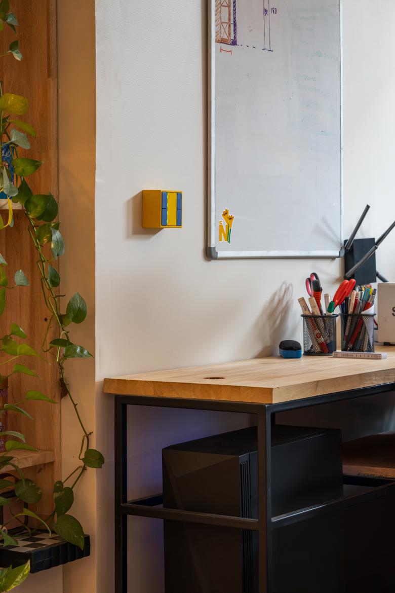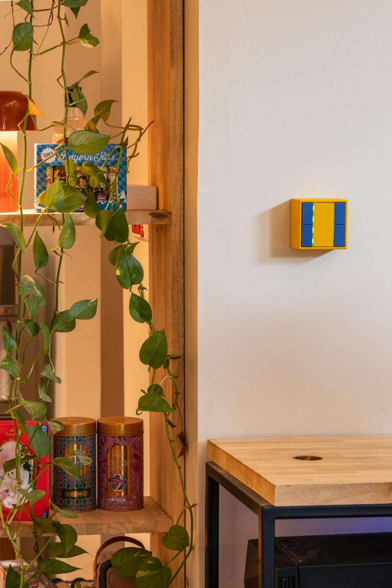 Für die Lichttechnik wurde die Serie LS CUBE in Les Couleurs® Le Corbusier ausgewählt. Ihre reduzierte Form und ihre Oberfläche zur Aufputzmontage passen zur industriellen Anmutung des Raums. Besonders auffällig ist die Kombination der Farben: Gelbe Rahmen mit blauen Tasten und rote Einsätze mit pinken Steckdosen. Diese bewusste Farbwahl schafft nicht nur visuelle Akzente, sondern unterstützt auch die Orientierung im Raum. Ergänzt wird das System durch KNX-F-50-Taster, die eine flexible Steuerung der Beleuchtung ermöglichen.