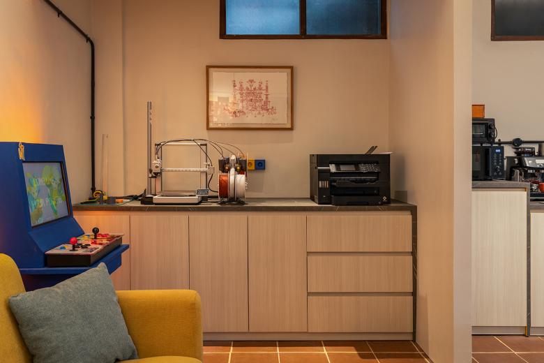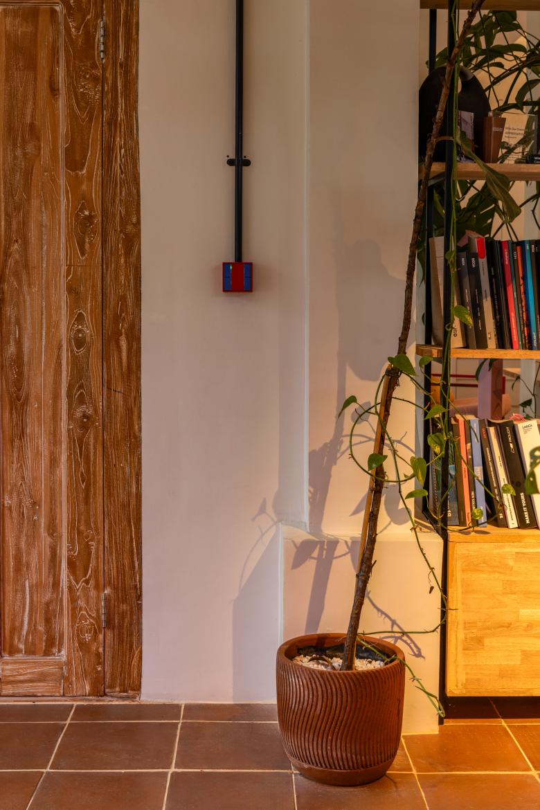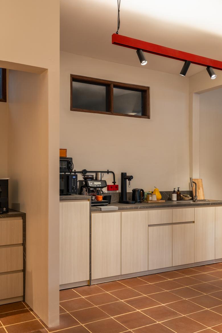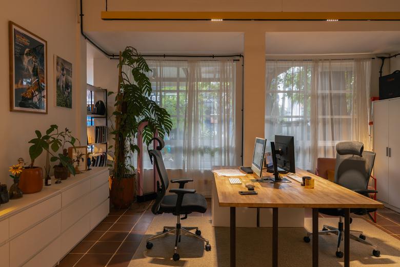 Das Büro des Studios befindet sich im Zentrum von Seminyak auf Bali. Es dient nicht nur als Arbeitsort, sondern auch als Ausdruck der eigenen gestalterischen Haltung. Die Räume kombinieren verschiedene Einflüsse und Materialien zu einer atmosphärischen Einheit. So treffen industrielle Elemente wie offen geführte Leitungen und sichtbare Verkabelung auf natürliche Materialien wie Holz, Rattan und Lehm. Farbige Akzente, handverlesene Kunstwerke und persönliche Objekte ergänzen das Raumgefühl. Das Ergebnis ist ein kreativer Ort, der sowohl funktional als auch lebendig ist. Im Innenraum zeigen sich bewusst gesetzte Kontraste. Weiße Wände, kräftige Terrakottafliesen und farbige Leuchten strukturieren die Räume. Die Möblierung ist funktional und teilweise maßgefertigt oder gefunden. Pflanzen und Tageslicht sind wichtige Bestandteile der Raumgestaltung und unterstreichen den offenen Charakter des Studios.