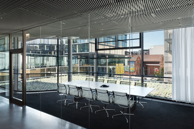 Der Erweiterungsbau besetzt zwei Blöcke der gründerzeitlichen Stadtstruktur und interpretiert deren typische Blockrandbebauung mit den halböffentlichen, durchgrünten Innenhöfen neu. Die gesamtstädtische Abfolge von Aufweitungen und Plätzen wird um die großzügigen Freitreppe und den sich daraus entwickelnden Platz erweitert. Bestandsgebäude und Neubauten werden mit dem zentralen Element des inneren Boulevards zu einem Haus verbunden. Der Boulevard ist eine transparente Ebene, auf der Konferenzbereiche, Kantine, Cafeteria, Sitzungszimmer und Kommunikationszonen angeordnet sind. Einem Straßenraum gleich weitet er sich zu kleinen Plätzen mit differenzierten Qualitäten auf: Er schwebt durch die vielfältig gestalteten Gärten im Blockinneren und öffnet sich am Haupteingang und am neuen ‘Pocket-Park‘ repräsentativ zum Straßenraum.