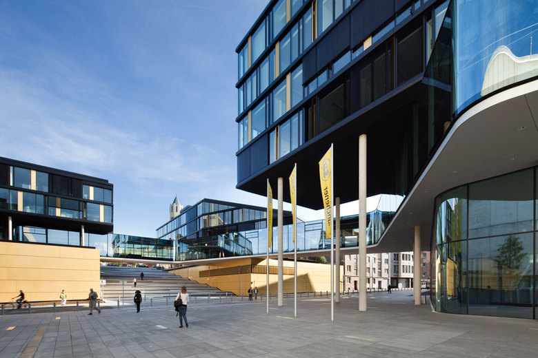 ADDED VALUE: Wenn Firmen mit ihren Zentralen große innerstädtische Areale besetzen, werden diese dadurch meist zu blind spots der Stadt, unattraktiv für die Öffentlichkeit, verödet außerhalb der Bürozeiten. Deshalb wird der Entwurf nicht als architektonische, sondern als städtebauliche Aufgabe verstanden mit dem Ziel öffentlichen Raum auf dem Grundstück zu maximieren. Mit einer Reihe von Plätzen, einer direkten Fusswegeverbindung zwischen Hauptbahnhof und Innenstadt und der Integration vom Fremdnutzungen wird die Attraktivität für die Öffentlichkeit erhöht. Der Forderung nach maximaler Öffentlichkeit und Kommunikation folgt auch die interne Organisation der Gebäude.