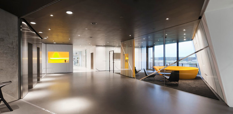ADDED VALUE: Im Unterschied zu konventionellen Bürotypologien ermöglicht die von kadawittfeldarchitektur entwickelte Ringstruktur des Gebäudes einen zweifachen Landschaftsbezug – sowohl zur äußeren Umgebung als auch zur kommunikativen Landschaft des Atriums. Die Laces als Verbindungsstege erlauben eine effiziente Erschließung aller Bürobereiche ohne Queren fremder Abteilungen. Gleichzeitig verwandeln sie das Atrium in das identitätsstiftende, kreative Zentrum des Gebäudes.
