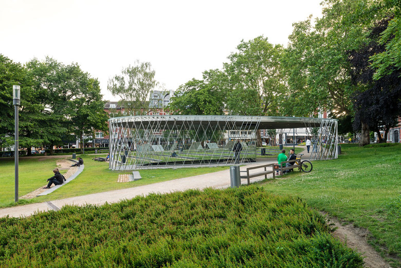 Die äußere Hülle besteht aus zwei Schichten sich diagonal überlagernder Edelstahlprofile. Der Zwischenraum zwischen dieser offenen Hülle und der eigentlichen gläsernen Einhausung der Fundstelle lädt den Besucher ein, vom Weg durch den Park abzuschweifen und so die archäologischen Funde zu erkunden. Die transparente und reduzierte Konstruktion entspricht dabei nicht nur den Erfordernissen des Bauens auf dem Grabungsfeld und den klimatischen Anforderungen der Fundstelle. Sie ermöglicht auch die behutsame Integration des Baukörpers in eine der beliebtesten Parkanlagen Aachens.
