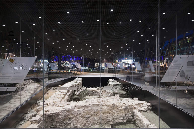 ADDED VALUE: In bewusster Abgrenzung von den im städtischen Kontext üblichen gläsernen Vitrinen umhüllt eine offene Edelstahlkonstruktion den notwendigen klimatischen Raumabschluss. Es entsteht eine spannungsreiche Zwischenzone, die offen zur umgebenden Gartenanlage zum Verweilen und zur Auseinandersetzung mit der Stadtgeschichte einlädt.