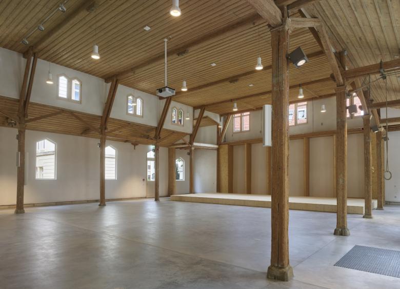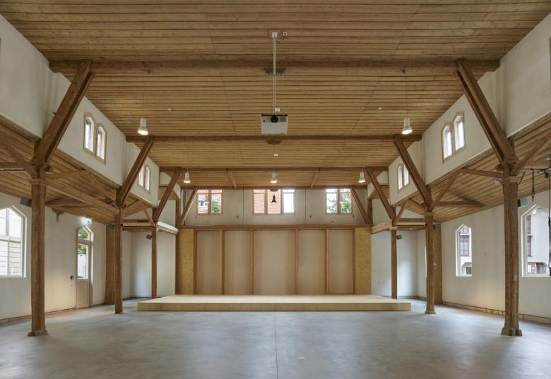 Im südlichen Bereich der Halle wird hinter der Projektionswand ein Stuhllager und Medienraum eingebaut. Im Bereich des Sitzpodests können weitere Einbauten ergänzt werden, erforderliche Medien wurden vorgerichtet.