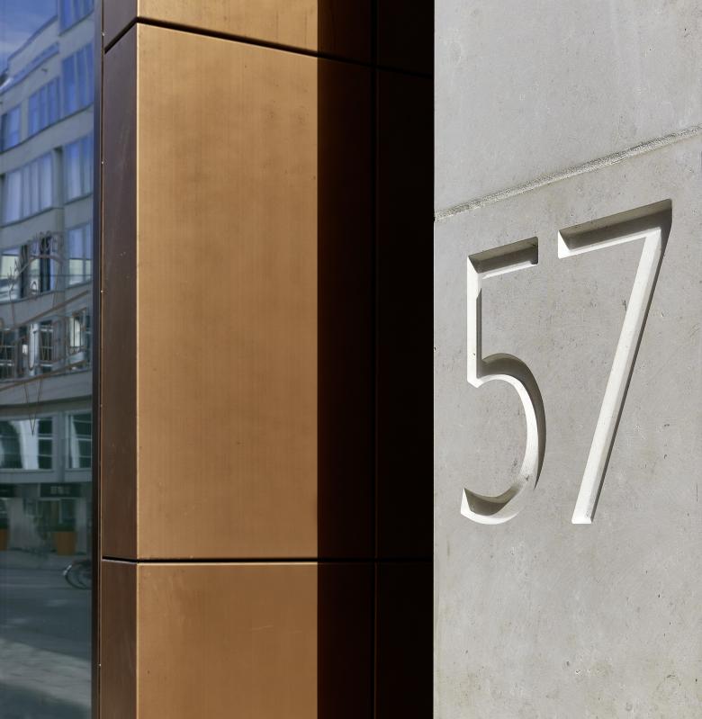 Das Büro- und Geschäftsgebäude am Neuen Wall 57 besteht aus 7 Obergeschossen und einem Unterge-schoss. Es gliedert sich in drei Bereiche: eine großzügige Sockelzone vom EG - 1.OG, darüber liegende vier Etagen und schließlich folgt eine Rückstaffelung des letzten Geschosses. Die Brüstung der daraus entste-henden Dachterrassen bildet den Abschluss der Fassade und dient gleichzeitig als optische Erhöhung, um selbstbewusst zwischen den direkten Nachbargebäuden seinen Platz einzunehmen.