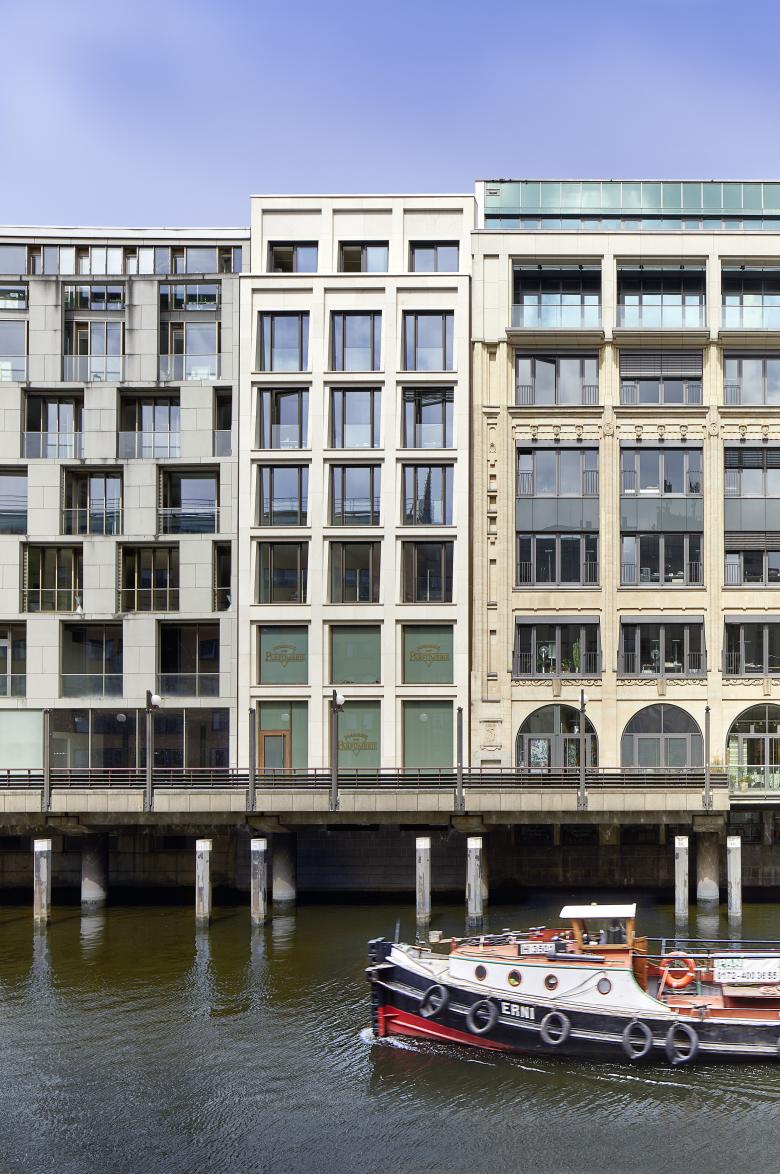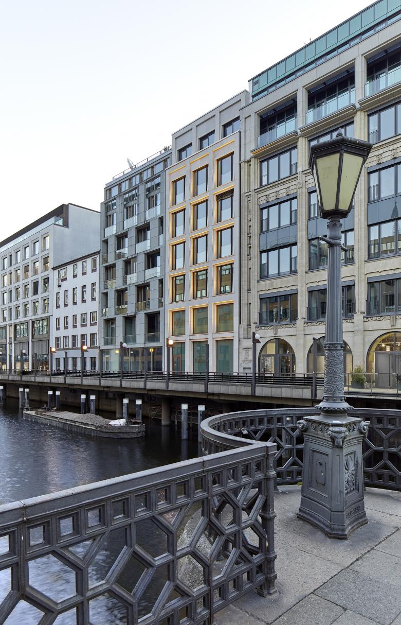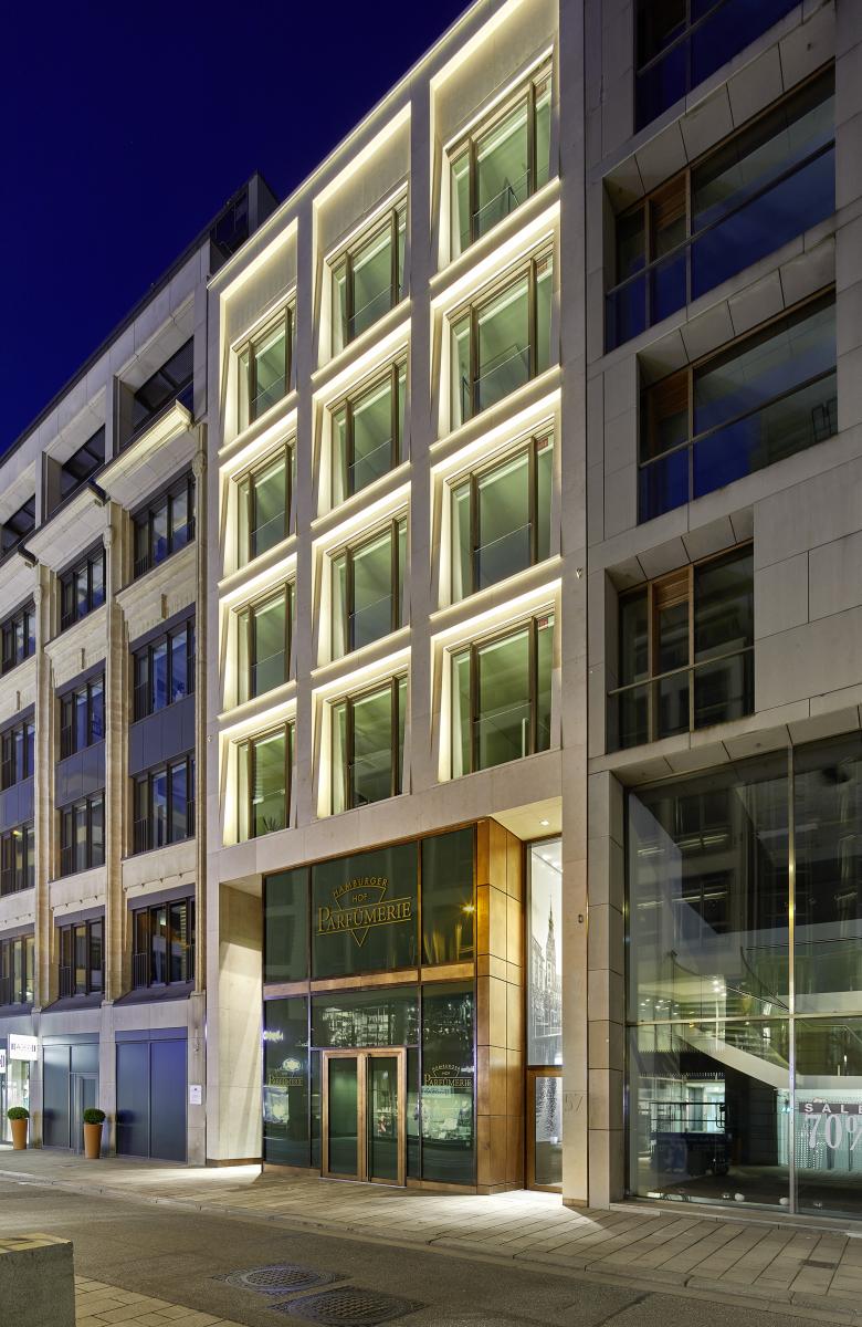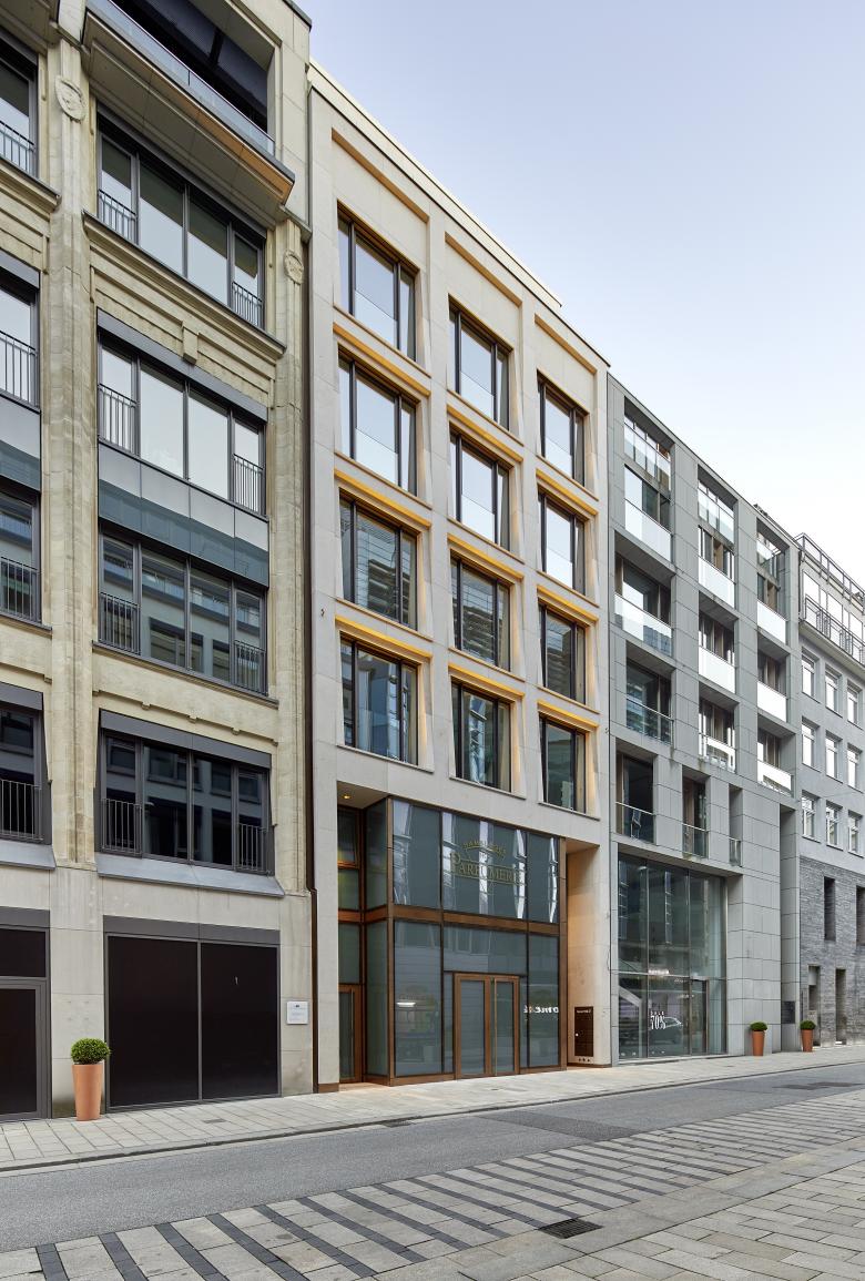 Als Fassadenmaterial wird ein heller Naturstein verwendet. Die zweigeschossige Ladenkonzeption wird dazu genutzt, einen übergroßen Schaukasten herzustellen, der sich durch die zurückgesetzten Eingänge als eigen-ständiges Element heraushebt. In den oberen Etagen dominieren große, bodentiefe Fensteröffnungen das Fassadenbild und sorgen für eine gute Belichtung der Büroräume. Gleichzeitig bieten sie dem Mieter einen optimalen Blick auf den Neuen Wall beziehungsweise Alsterfleet.