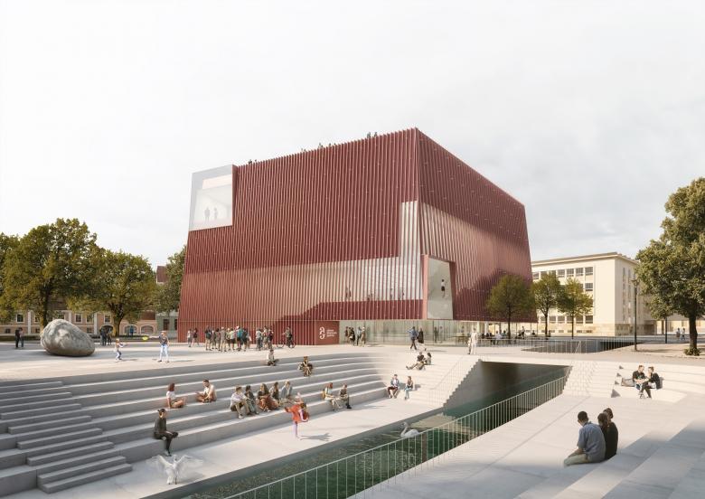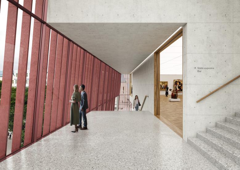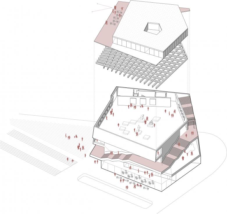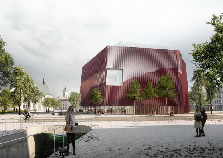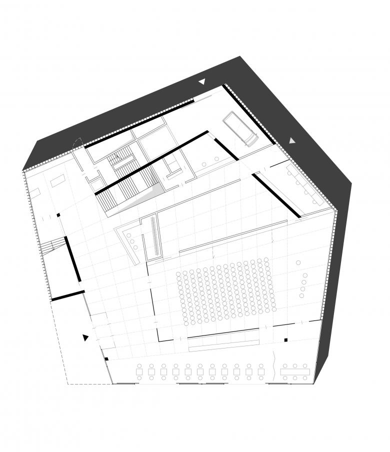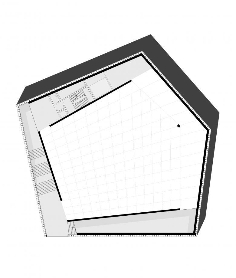 Unser Entwurf für das neue Galeriegebäude ist an einem besonderen Ort am Rande des historischen Zentrums von Budweis geplant, dort, wo früher die Stadtmauern standen. Mit dem Entwurf des Gebäudes und des angrenzenden Platzes bietet sich die Chance, diesem Bereich eine neue Bedeutung zu geben. Unser Design nimmt Elemente der alten Stadtmauern auf und übersetzt sie in eine moderne Form. Dabei legen wir besonderen Wert darauf, das Gebäude offen und zugänglich für die Stadt und ihre Menschen zu gestalten. Mit seiner fünfeckigen Grundform passt es sich dem Bauplatz an, wird nach oben hin schmaler und erinnert in seiner Form an einen alten Festungsturm. Das oberste Stockwerk ist zurückversetzt, dort sollen sich Büroräume und eine Bar mit Aussicht befinden.