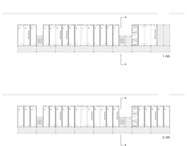 ARCHITEKTUR – Geplant ist eine Containeranlage bestehend aus 53 Atelier- und drei Café/Ausstellungs- und Shopmodulen. Der dreigeschossige Riegel ist parallel zur Vogelsanger Straße gen Süden gerichtet. Erschlossen werden die einzelnen Ateliercontainer über einen vorgeschalteten Laubengang an den sich zwei Treppenräume angliedern. Die 53 Atelierräume mit den Containermaßen 10x3x3m können flexibel als Single- oder Gemeinschaftsbüro genutzt werden. Dementsprechend kann ein Atelier von 24m² auf 82m² erweitert werden. Insgesamt beträgt die Atelierfläche der Zwischennutzung 1.349m². Im Erdgeschoss befinden sich neben den Erschließungs- und Atelierflächen ein Shop- und ein Ausstellungsraum von 53m², ein Café von 24m², sowie eine anschließende Terrasse zum Verweilen. Die Nassräume sind in allen drei Geschossen an die Treppenräume angegliedert.
