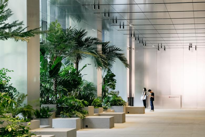 Beim Übergang von den geschäftigen U-Bahn-Ausgängen und Straßen von Lai Chi Kok zum Gelände wandelt sich die Umgebung zu einer ruhigeren Sackgasse, in der der Verkehr abnimmt und der grüne Bergblick sichtbar wird. Das dreistöckige Podium umfasst vier Hauptbereiche: kommerzielle Einzelhandels- und Gastronomiegeschäfte, zwei Hauptlobby-Eingänge der Zwillingstürme, ein flexibel nutzbares Auditorium und eine große durchgehende Grünfläche, die sich vom zweiten Stock bis zum Erdgeschoss erstreckt. Sorgfältig geplantes Geschäftliche-Lichtdesign stellt sicher, dass diese Bereiche sowohl einladend als auch funktional sind und die vielfältigen Aktivitäten im Podium optimal unterstützen.