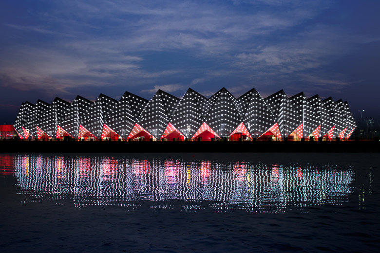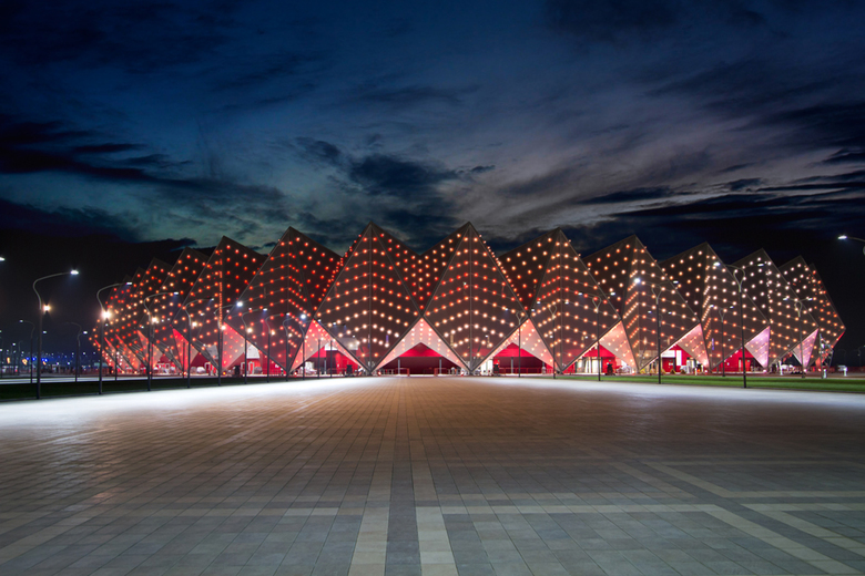 Pünktlich zum Eurovision Song Contest 2012 konnte die Baku Crystal Hall - ein moderner, multifunktionaler Veranstaltungskomplex, in dem bis zu 23.000 Besucher Platz finden - nach der Rekordbauzeit von lediglich acht Monate fertiggestellt werden. Seine charakteristische, kristalline Erscheinung verdankt der 206 Meter lange und 168 Meter breite Stahlbau seiner Verkleidung mit einer illuminierten Membranfassade, die vor allem nachts zu beeindrucken weiß: 5.400 LED-RGB-Lichtpunkte setzen das Gebäude eindrucksvoll in Szene und erzeugen so ein prägnantes Bild mit Fernwirkung.