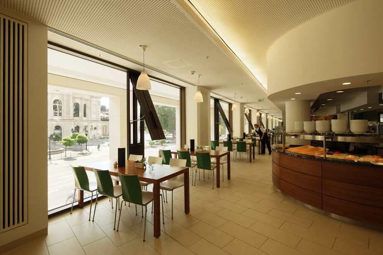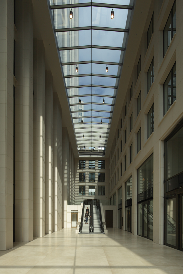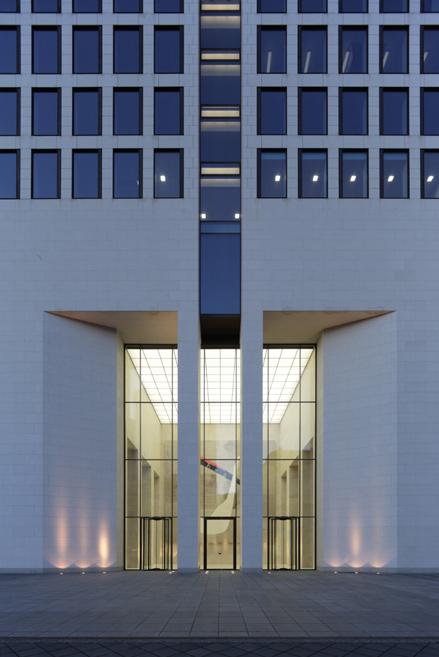 Der Opernturm stellt eines der bedeutendsten Hochhausprojekte im europäischen Finanzzentrum Frankfurt am Main dar. Das in etwa 170m hohe Gebäude wird durch vertikale Nischen optisch in vier schlanke Türme geteilt, die durch eine Brücke an der Spitze wieder zusammengeführt werden. Eine niedrige Blockbebauung verankert den Gebäudekomplex in der Umgebung, wobei die verschiedenen Eingänge zum Gebäude in ihrer stadträumlichen Präsenz differenziert herausgearbeitet wurden. Den repräsentativen Haupteingang bildet eine Empfangshalle mit großformatiger Lichtdecke, in deren exklusiver Atmosphäre auch Kunstobjekte in Szene gesetzt werden können. Ein harmonischer Umgang mit Kunst- und Tageslicht zeichnet den als offene Plaza ausgebildeten kommunikativen Kern des Komplexes aus. Die Inszenierung der Außenwirkung des Gesamtensembles in der nächtlichen Skyline Frankfurts stellte eine besondere Herausforderung dar. Während die zum Opernplatz ausgerichtete Blockbebauung angemessen auf die historische Substanz reagiert, wurde zugleich ein prägnantes Bild in der Fernwirkung erzeugt.