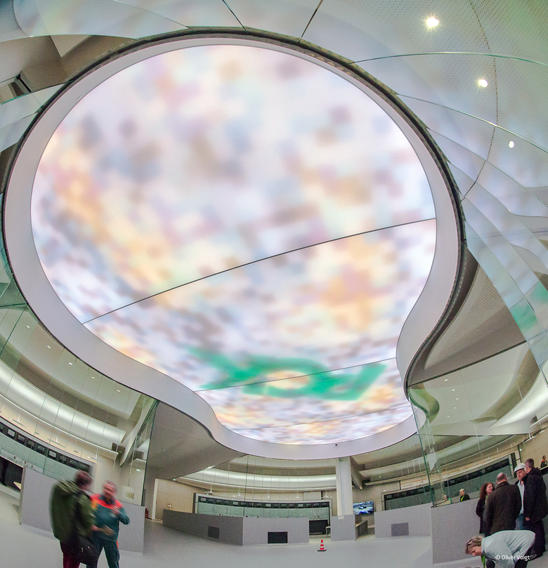 Der erdnussförmige zentrale Bereich der Messwarte wird komplett von einer Lichtdecke mit einer Größe von ca. 110 qm bedeckt. Diese ist bestückt mit LED-RGB Kacheln. Jedes Pixel einer Kachel ist einzeln adressierbar. Die LED-Pixel haben einen Abstand von 6,25 cm. Damit lassen sich sehr gut dynamische Änderungen der Wetterzustände realisieren: vorüberziehende Wolken, Dämmerung, Nacht. In Zusammenarbeit mit dem Fraunhofer Institut wurden Vorgaben für die Lichtszenenabläufe (Wetterverläufe) entwickelt. Die Bandbreite wurde definiert, in der sich zu den unterschiedlichen Tages- und Nachtzeiten die Helligkeit und Farbtemperatur bewegt, während sich der Anblick des künstlichen Himmel ununterbrochen stetig ändert. Die Wetterzustände werden über einen parametrisierten digitalen Himmel von einem Videoserver in Echtzeit erzeugt.