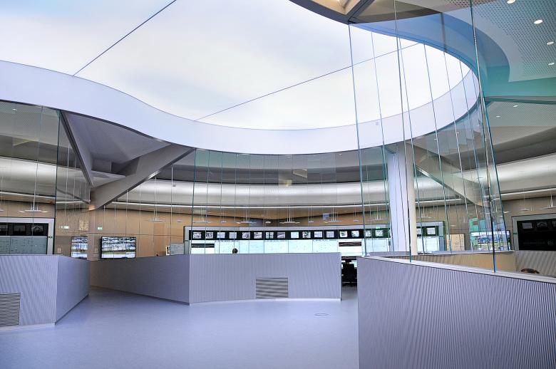 Der Auftraggeber hat keinen Aufwand gescheut, um eine bunkerähnliche Atmosphäre zu vermeiden. Zwei Raumelemente wurden hierfür entwickelt: Das Digitale Fenster und ein virtueller Himmel.