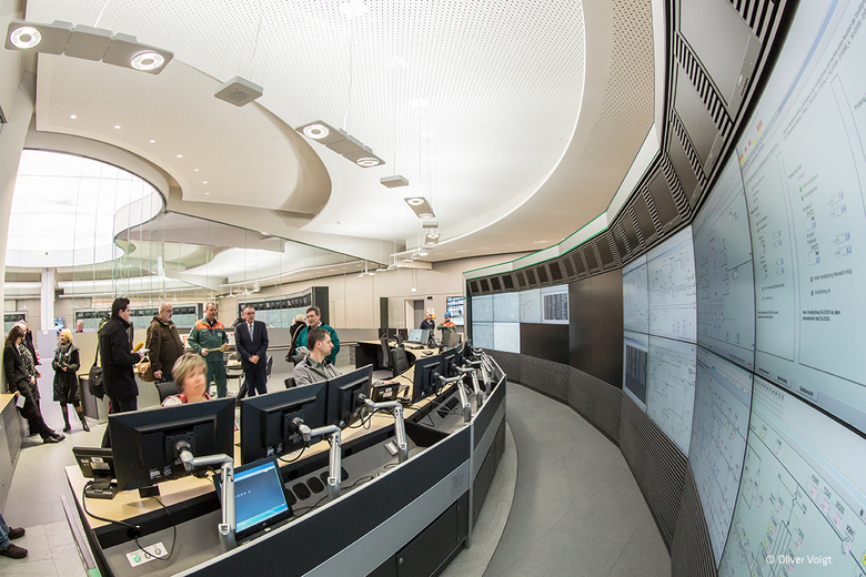 Die Ölraffinerie „PCK” in Schwedt hat ihre Messwarte modernisiert und dafür ein etwa 1000 qm großes Gebäude erstellen lassen. Dieses Gebäude ist ein fensterloser Bunker gegen Feuer und Explosionen geschützt. Hier arbeiten 6 Teams rund um die Uhr in 3 Schichten. Die Trennwände zwischen den Teams sind als transparente Glaswände ausgeführt. So kann man von jeder Stelle aus die gesamte Messwarte überblicken. Die Außenwände als raumbegrenzenden Flächen wurden umlaufend mit Wandflutern beleuchtet.