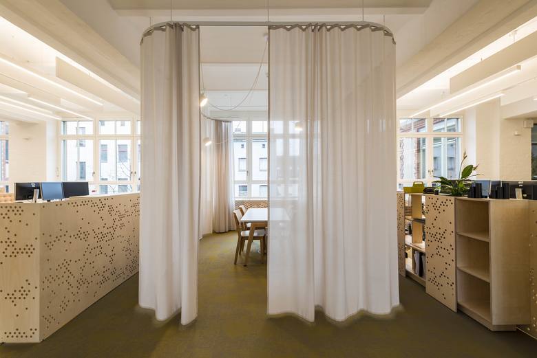 Der Wikinghof bietet eine offene Arbeitsumgebung, die einen Rhythmus von Büro- und Entspannungsbereichen in einem historischen Kontext schafft. Das denkmalgeschützte Projekt wurde ursprünglich 1899 erbaut und 1912 erweitert. Die Funktion war von Anfang an ein Wohnhaus im Vorderhaus und Produktionsebenen im hinteren Bereich zu den Innenhöfen hin.