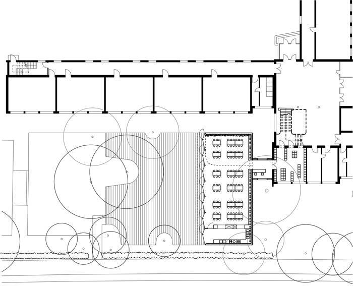 Der Mensaneubau erweitert das Gebäudeensemble der Schule auf dem Tempelhofer Feld in Berlin Tempelhof. Die nach dem 2. Weltkrieg errichtete Grundschule folgt mit ihren von den Straßenräumen abgerückten Gebäudekubaturen, den städtebaulichen Idealen der 50er Jahre. Die neue Mensa vervollständigt den bestehenden, windmühlenartig angelegten Hauptbau um den vierten Flügel, wobei die Typologie der durchgrünten Stadt gestärkt wird, der Parkcharakter des Grundstücks setzt sich im Innenraum fort. Die sichtbaren filigranen Holzspanten des Dach- und Wandtragwerks steht im direkten Bezug zur Lage des Gebäudes unterhalb der Baumkronen, und kann als zweites "Astwerk" gelesen werden. Die Glasfront erweitert den Speiseraum zu einem baumbestandenen Holzdeck, die Grenzen von gewachsenem Holz und Holzkonstruktion werden bewusst überlagert.