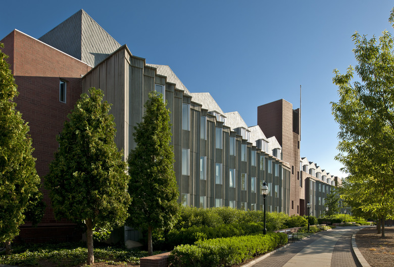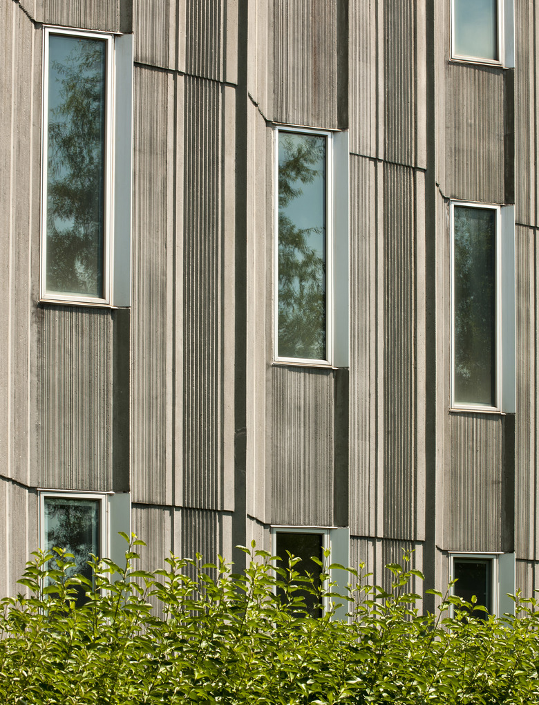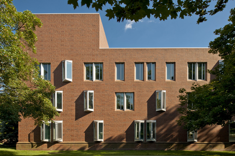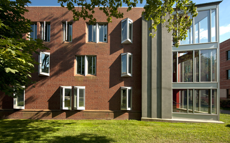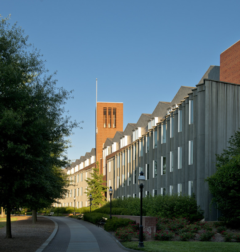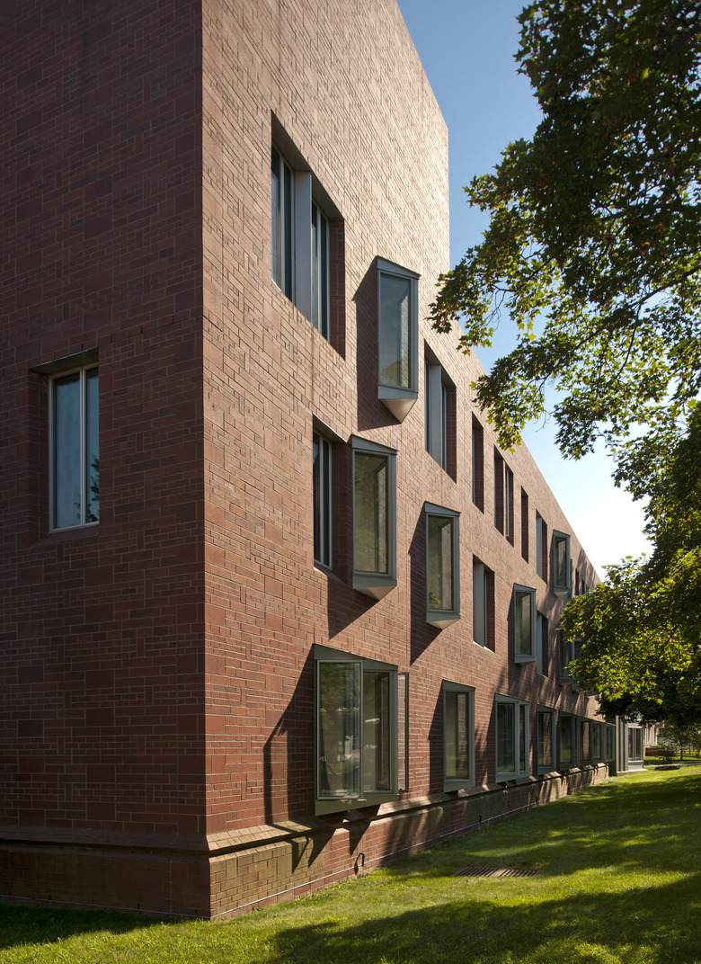 The building is a 267-bed dormitory formed along a double-loaded corridor, configured as a “J” in plan to optimize its site between a 1960s dormitory complex by Hugh Stubbins to the west and a 1980s laboratory by Venturi Scott Brown to its east. Completed in 1998, the dormitory’s mass defines three sides of a residential courtyard, while the fourth side is edged by a low wall and a tree-lined allée. Glass and aluminum pavilions housing the major public functions attach to the three courtyard edges.