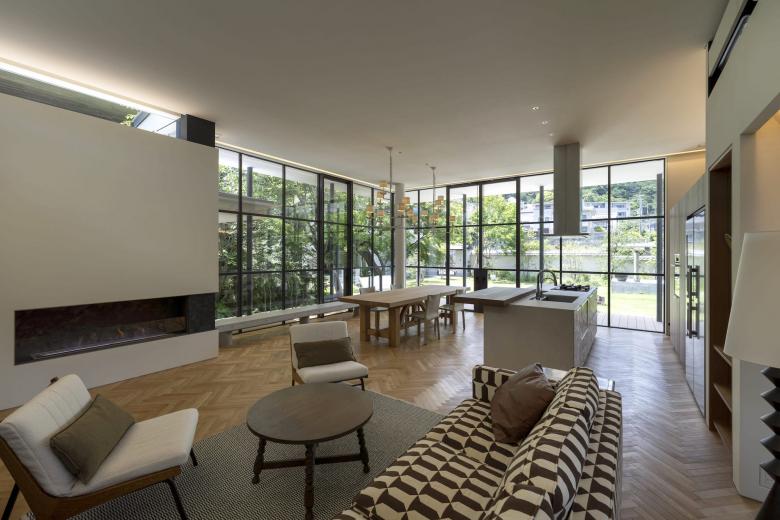 As the entire site is enclosed by local materials, ensuring a degree of privacy, the building achieves a bold openness that would typically be difficult to realise. This plan allows children and the family to remain constantly connected to the forest and nature.