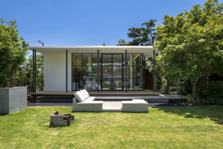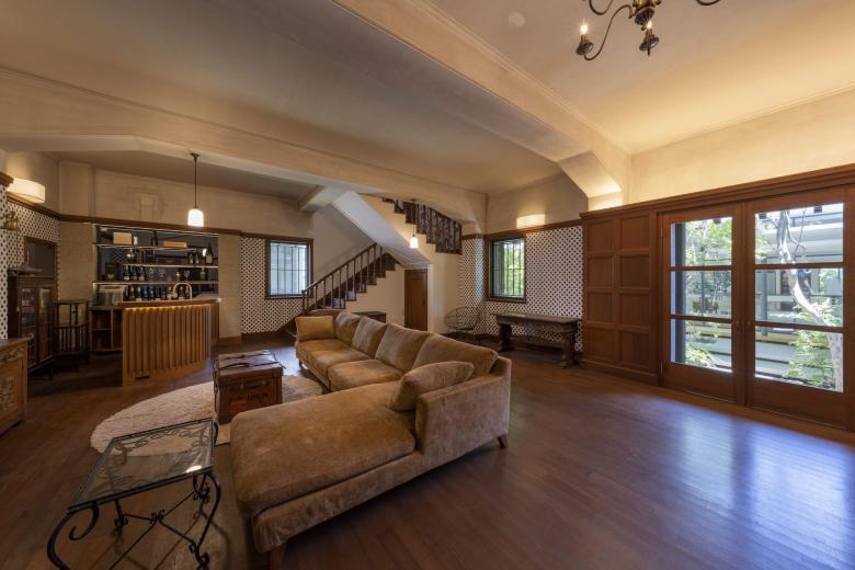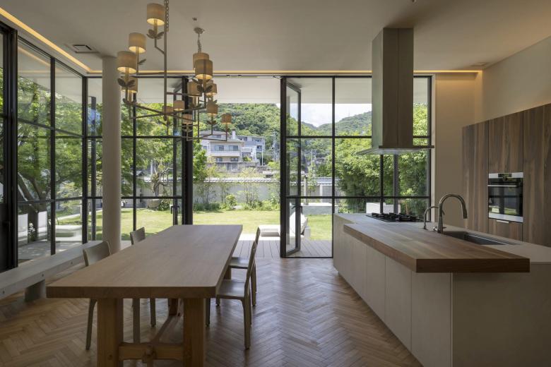 The main living-dining-kitchen area in the main house features a ceiling height of 3.2 m, accommodating the owner's stature. Slim, sharply edged lattice windows face the garden and storehouse, creating an open space where one can enjoy the garden while sensing the presence of the historic storehouse. The guest house, which also serves as a car park, includes a golf room for spending time with friends. This section is also designed to face the main house and storehouse, creating a harmonious relationship between the buildings. The garden features only the remains of an air-raid shelter, with no other large structures, allowing children to play freely. The renovation avoided major structural alterations, preserving the original design and the accumulated patina of time.