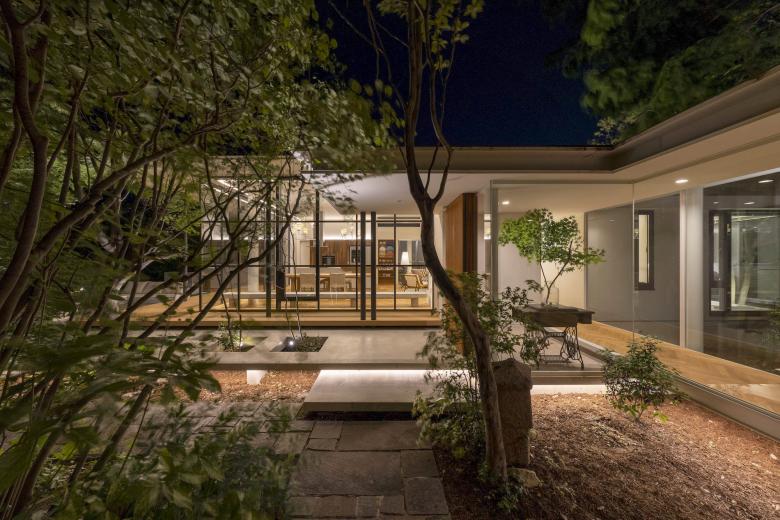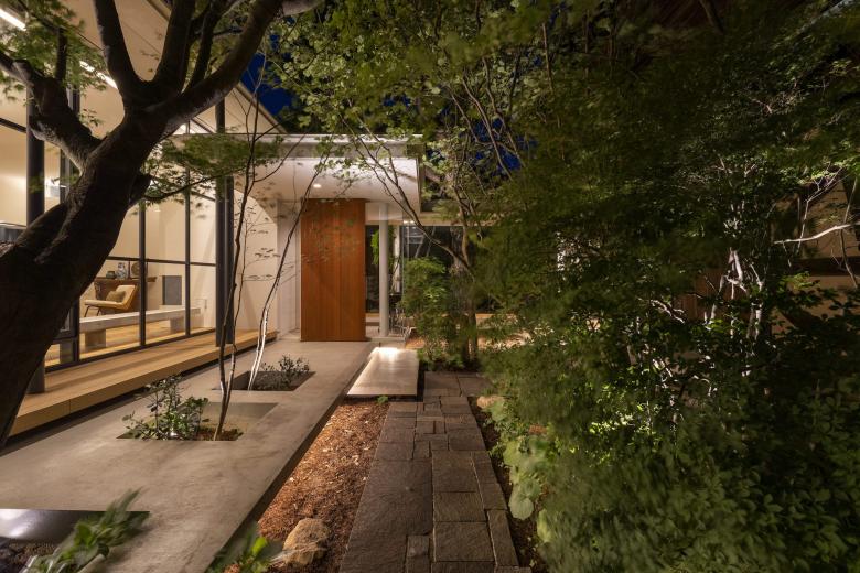 Approaching the gate, glimpses of the main house appear intermittently as one walks along the approach paved with Teppei stone, flanked by lamp posts and dogwood trees. Beyond this, one passes through a tunnel of Japanese maples and small-leaved maples, which turn crimson in autumn, arriving at the entrance to the main house and storehouse, connected by a glass-walled corridor. The view extends through the glass to the inner courtyard, where vibrant autumn foliage of dogwood and a towering Himalayan cedar, serving as a symbolic landmark, greet visitors.