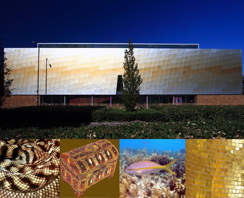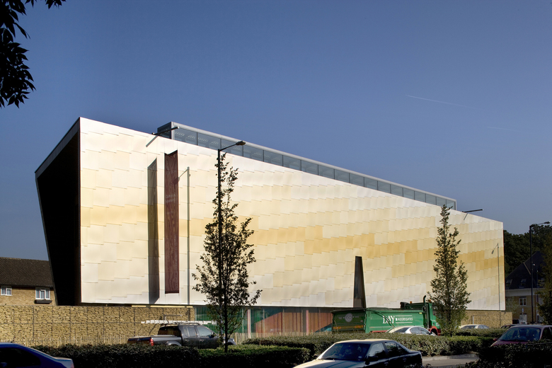 The building concept is of a jewellery box containing all kinds of precious cultural treasures. The aim was to create a gentle landmark and reflect the culture diversity of the town. Overlapping snakeskin anodised aluminium panels, in 5 shades of gold and silver, spiral up around the building. The cladding pattern, inspired by the lateral line found on fish which help them balance in water, and Byzantine gold mosaics, is designed to enrich the simple rectilinear form of the building. Cedar cladding, reflecting the softer, more pastoral and natural environment is used on the canal side elevations.
