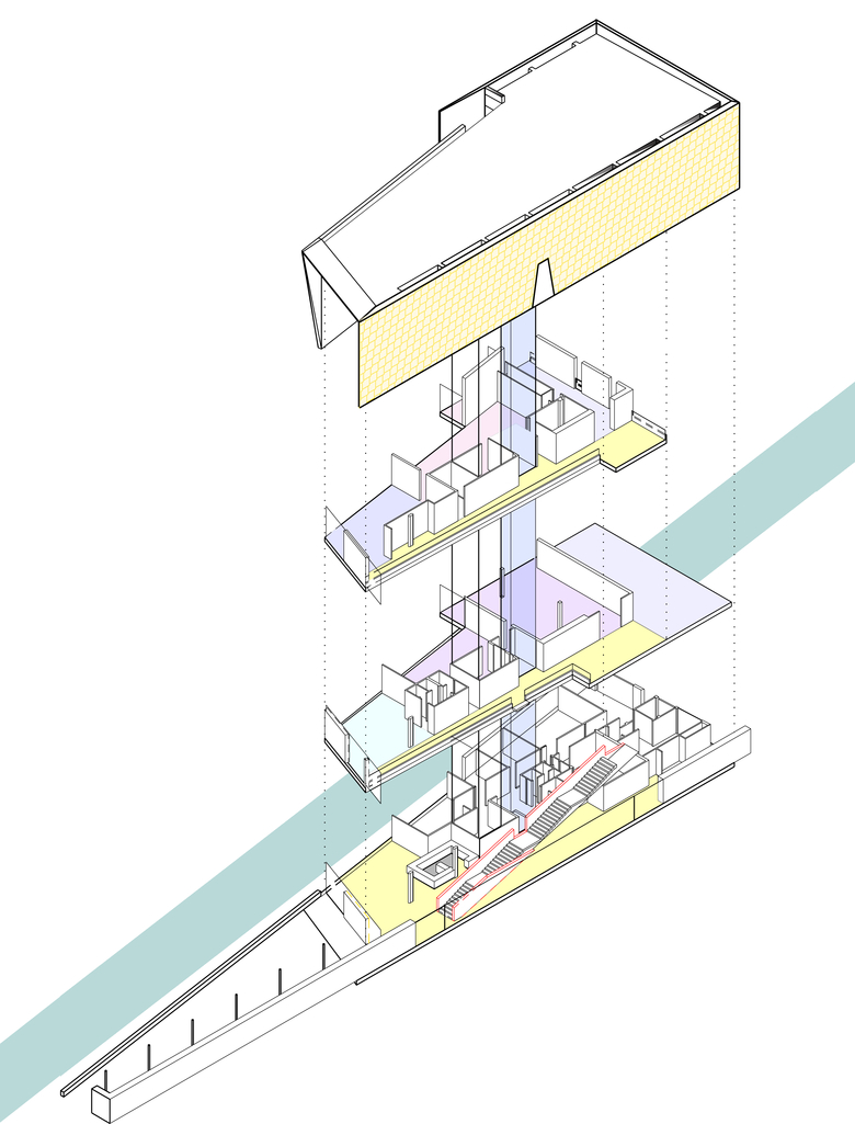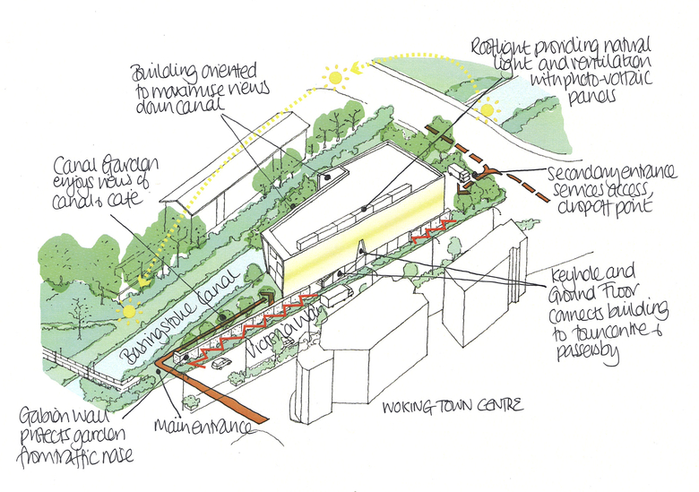 The building is linked to Woking's energy-saving combined heat and power system. The entire building is naturally ventilated - drawing air in from the canal side of the building - except the galleries. Roof lights provide daylight as well as forming the extract ventilation air path to the loggia and generating energy with PVs. The building is highly insulated and naturally ventilated in all but the main galleries.
