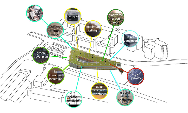 The project has been used as a flagship for sustainable design by Lincoln City Council. Its shape and orientation maximises use of natural light and ventilation, and 70% of the heating load is provided via ground source heat pumps. A green roof helps stabilise the temperature of the building, reduces overall energy demand and could help with storm water run off in times of heavy rainfall. The roof was planted with a seed mix to reflect the local biodiversity of Lincoln meadow.