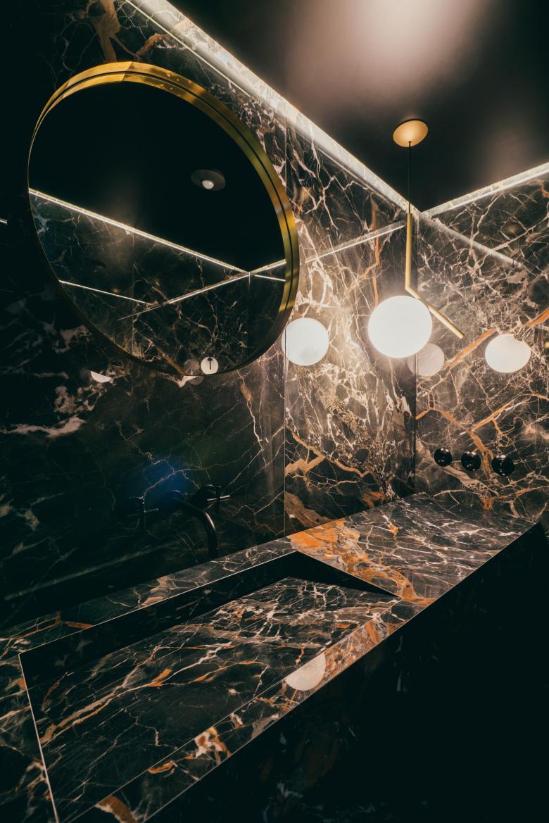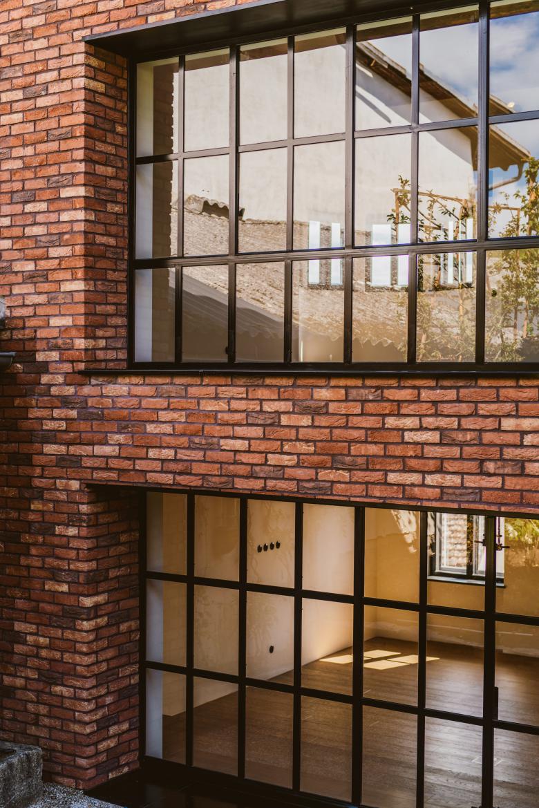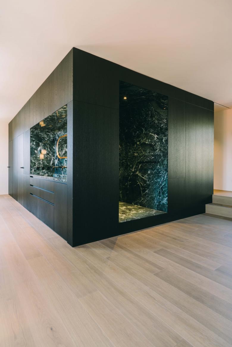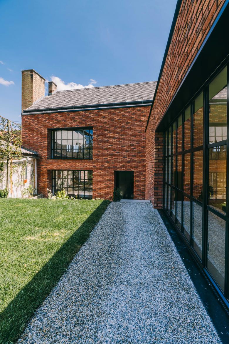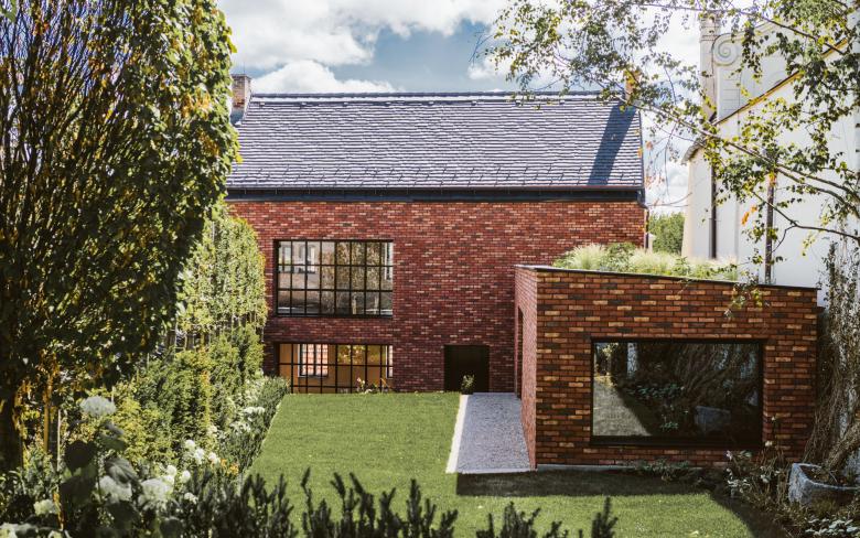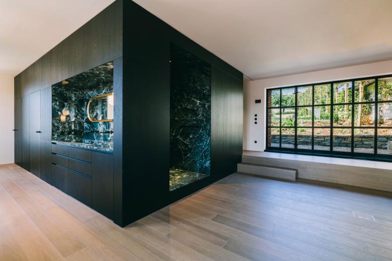 The garden house on the same property also houses a fitness room and sauna, also with a view of the greenery. The wine cellar has also been revitalized and can now be used for gatherings. The clinker facade is characteristic of the region and integrates the building perfectly into the neighborhood. The floor plan in the living area was deliberately designed free and without limiting walls. On the levels, a box of spectacular green marble and black oak dominates through the floors. Depending on the level, this houses the bathroom, kitchen, staircase or wardrobe. Large industrial style steel framed windows connect the interiors to the garden and allow plenty of natural light throughout the day. In the uppermost part there is a library gallery, which provides a view of the open wooden roof truss.